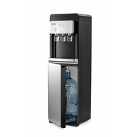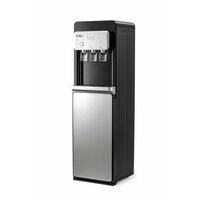 Напольный кулер для воды с электронной системой охлаждения. Корпус диспенсера выполнен из металла и высококачественного пластика черного цвета с серебряными вставками. Производительность аппарата позволяет всего за один час охладить 0.7 литра воды, а также подготовить 5 литров кипятка. Модель оснащена тремя кранами типа "нажим кружкой" для подачи воды (холодная/горячая/комнатная). Отслеживать режимы работы удобно благодаря наличию индикаторов на лицевой панели кулера. При необходимости функции нагрева и охлаждения можно отключить с помощью тумблеров, расположенных на задней панели устройства. Модель оборудована системой защиты от случайного ошпаривания (защита от детей). Нижняя установка бутыли. Аппарат предназначен только для использования чистой бутилированной