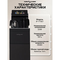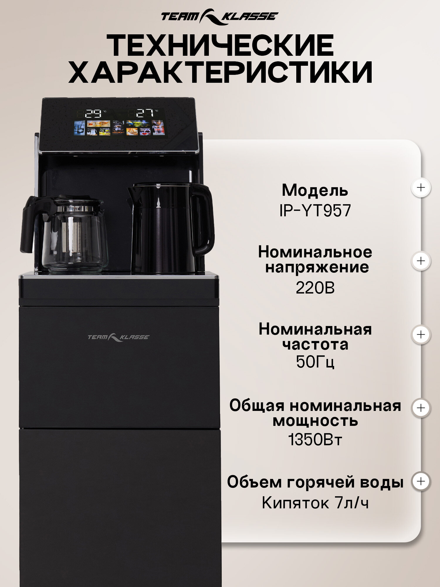 Напольный кулер с чайным столиком Team Klasse IP-YT957 - тиабар с нижней загрузкой бутыли. Два чайника — для кипячения и заварки. Нагрев воды в чайнике до 100°С. Шкафчик для хранения. Управление с помощью сенсорной панели управления на русском языке на столешнице. Верхняя часть представляет собой стойку с двумя кранами направленного типа, совмещенную с информационным дисплеем с индикацией работы аппарата. Функция регулировки температуры воды позволяет задавать нужную температуру воды в чайнике для кипячения в диапазоне от 40°С до 100°С. Функция энергосбережения включается через 5 мин, если аппарат не используется. Функция регулировки времени отключения подогрева заварочного чайника позволяет задавать режим постоянного подогрева чайника на 1-12 часов. Датчик отсутствия воды — при отсутствии воды в чайнике нагрев автоматически отключается. Датчик уровня воды — защита электрического чайника от перелива воды. В комплекте идет дистанционный пульт управления. Подача воды в чайник не требует открытия крышки. Нагрев воды в чайнике включается вручную. Правый кран подает воду непосредственно в чайник. В верхней части корпуса есть шкафчик для хранения продуктов, у шкафчика и отсека для бутыли отдельные дверцы. Для экономии места поставляется в частично разобранном виде, перед использованием требуется сборка.