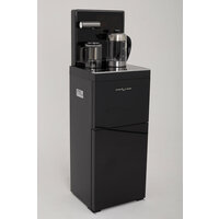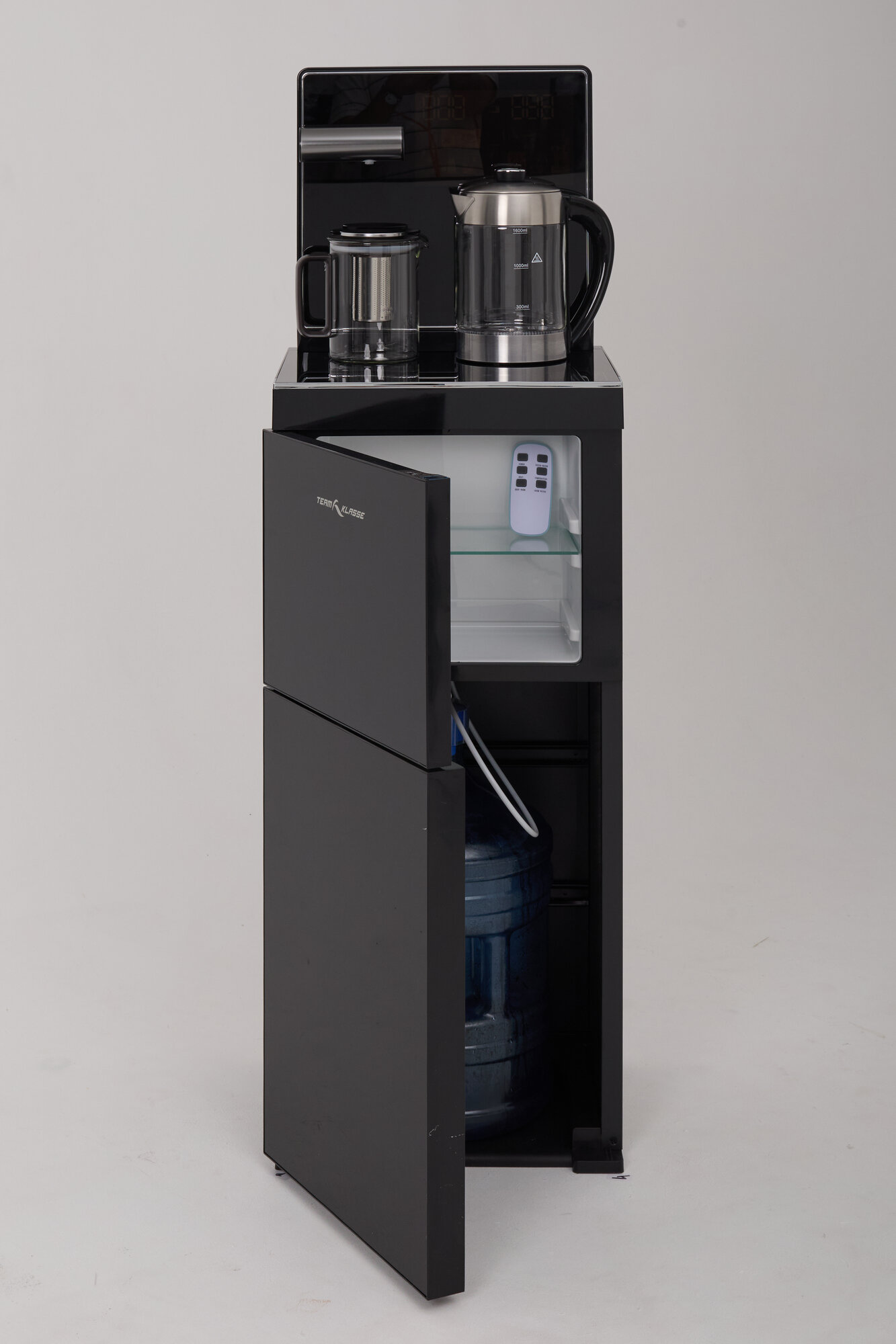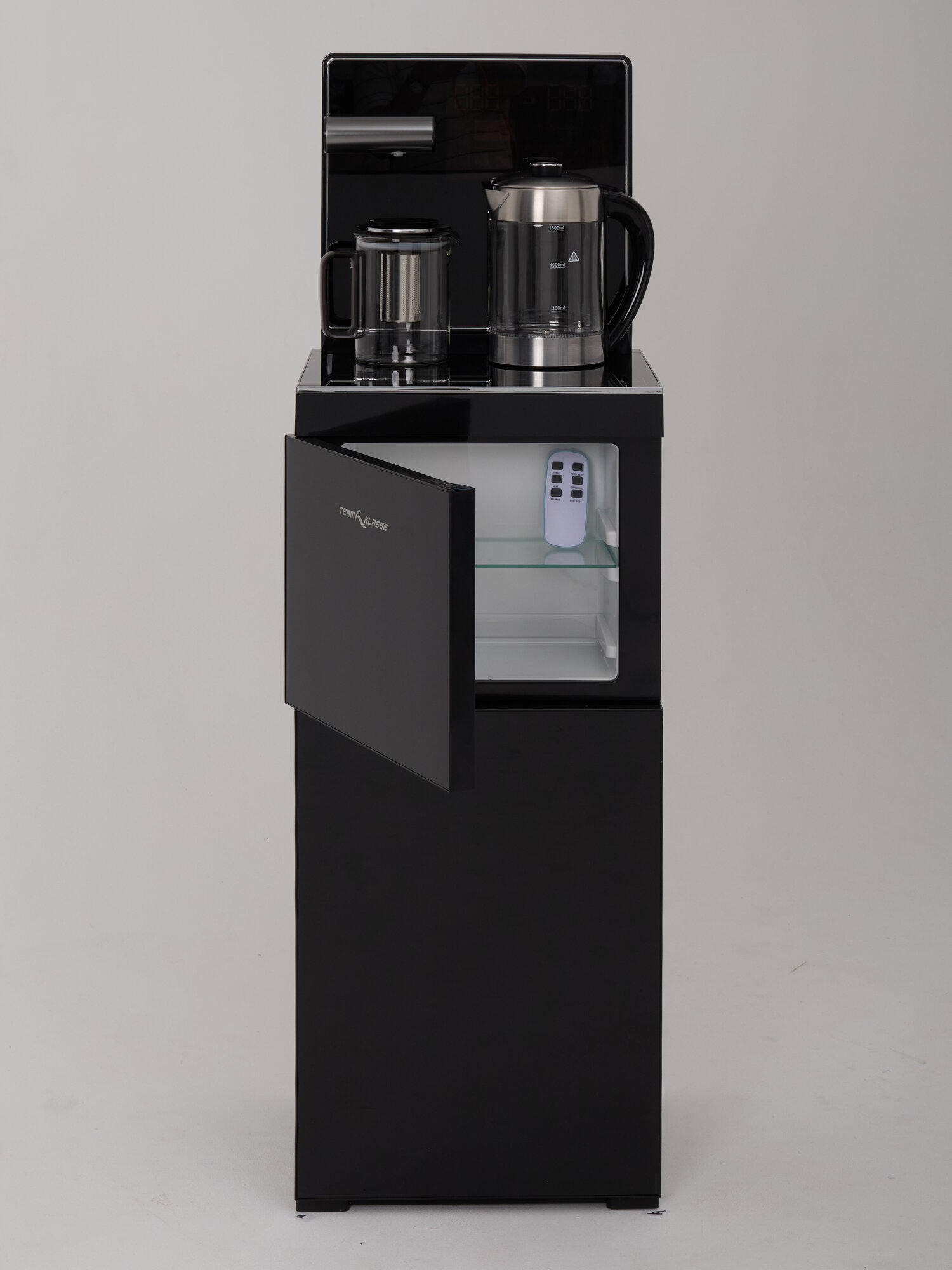 Напольный кулер с чайным столиком Team Klasse IP-YT963 - тиабар с нижней загрузкой бутыли. Два чайника — для кипячения и заварки. Нагрев воды в чайнике до 100°С. Шкафчик для хранения. Управление с помощью сенсорной панели управления на русском языке на столешнице. Верхняя часть представляет собой стойку с двумя кранами направленного типа, совмещенную с информационным дисплеем с индикацией работы аппарата. Функция регулировки температуры воды позволяет задавать нужную температуру воды в чайнике для кипячения в диапазоне от 40°С до 100°С. Функция энергосбережения включается через 5 мин, если аппарат не используется. Функция регулировки времени отключения подогрева заварочного чайника позволяет задавать режим постоянного подогрева чайника на 1-12 часов. Датчик отсутствия воды — при отсутствии воды в чайнике нагрев автоматически отключается. Датчик уровня воды — защита электрического чайника от перелива воды. В комплекте идет дистанционный пульт управления. Подача воды в чайник не требует открытия крышки. Нагрев воды в чайнике включается вручную. Правый кран подает воду непосредственно в чайник. В верхней части корпуса есть шкафчик для хранения продуктов, у шкафчика и отсека для бутыли отдельные дверцы. Для экономии места поставляется в частично разобранном виде, перед использованием требуется сборка.
