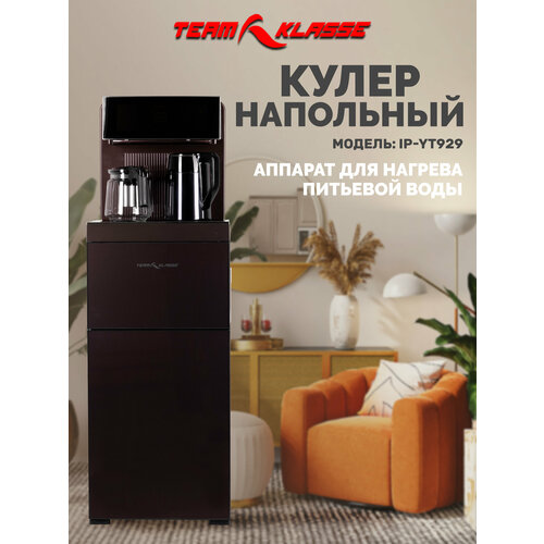 Напольный кулер с чайным столиком Team Klasse IP-YT929-5 - тиабар с нижней загрузкой бутыли. Два чайника — для кипячения и заварки. Нагрев воды в чайнике до 100°С. Охлаждения воды нет. Шкафчик для хранения. Управление с помощью сенсорной панели управления на русском языке на столешнице. Верхняя часть представляет собой стойку с двумя кранами направленного типа, совмещенную с информационным дисплеем с индикацией работы аппарата. Функция регулировки температуры воды позволяет задавать нужную температуру воды в чайнике для кипячения в диапазоне от 45°С до 100°С. Функция энергосбережения включается через 5 мин, если аппарат не используется. Функция регулировки времени отключения подогрева заварочного чайника позволяет задавать режим постоянного подогрева чайника на 1-12 часов. Датчик отсутствия воды — при отсутствии воды в чайнике нагрев автоматически отключается. Датчик уровня воды — защита электрического чайника от перелива воды. В комплекте идет дистанционный пульт управления. Подача воды в чайник не требует открытия крышки. Нагрев воды в чайнике включается вручную. Правый кран подает воду непосредственно в чайник, левый кран — для подачи воды из бутыли. В верхней части корпуса есть шкафчик для хранения продуктов, у шкафчика и отсека для бутыли отдельные дверцы. Для экономии места поставляется в частично разобранном виде, перед использованием требуется сборка.