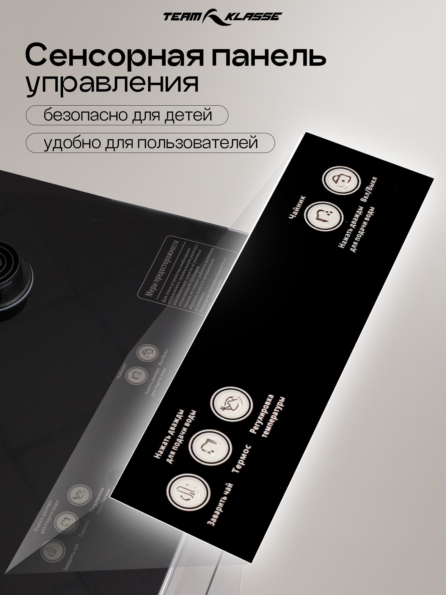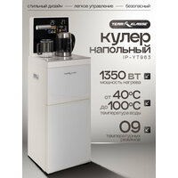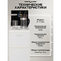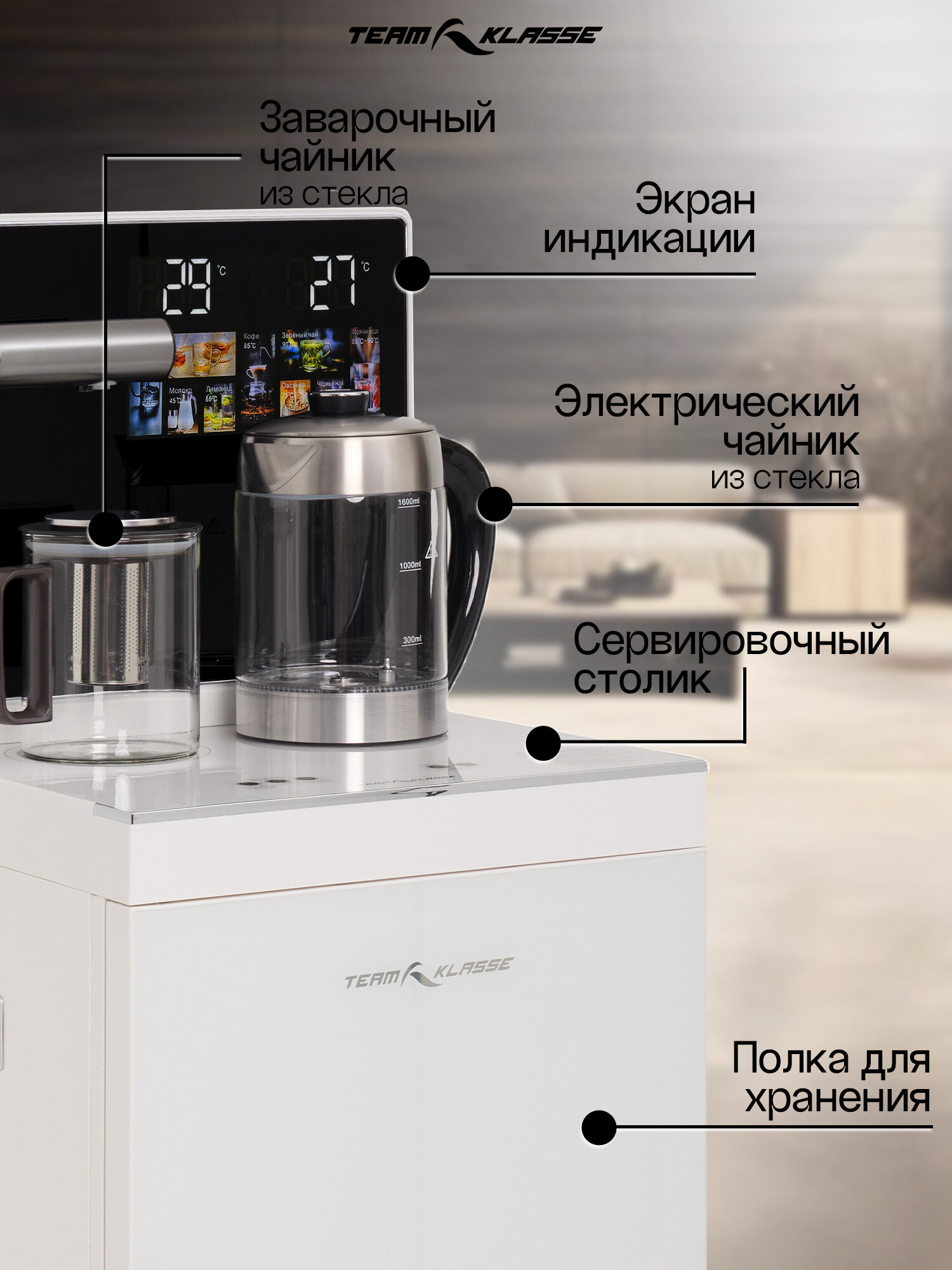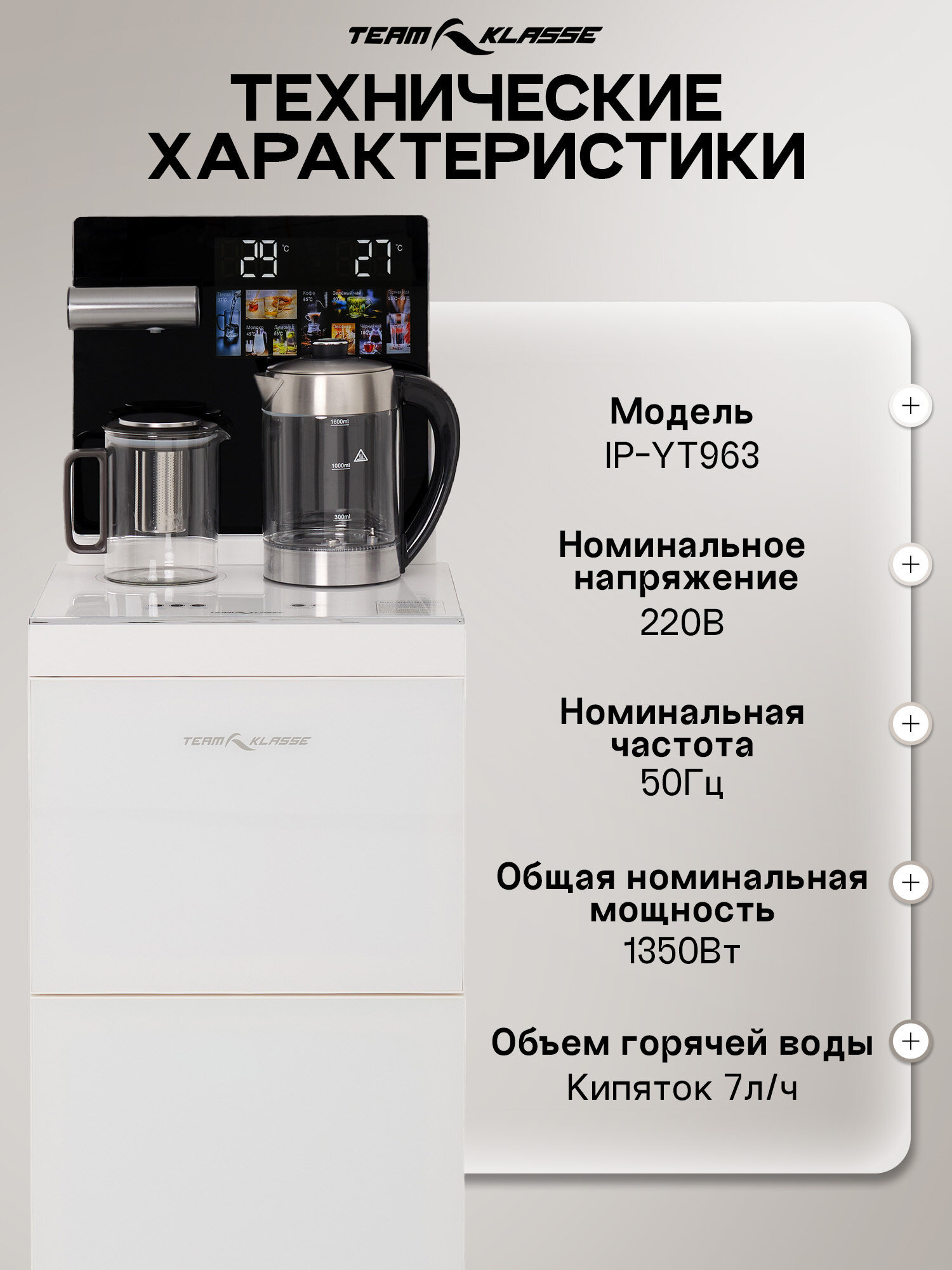 Напольный кулер с чайным столиком Team Klasse IP-YT963 - тиабар с нижней загрузкой бутыли. Два чайника — для кипячения и заварки. Нагрев воды в чайнике до 100°С. Шкафчик для хранения. Управление с помощью сенсорной панели управления на русском языке на столешнице. Верхняя часть представляет собой стойку с двумя кранами направленного типа, совмещенную с информационным дисплеем с индикацией работы аппарата. Функция регулировки температуры воды позволяет задавать нужную температуру воды в чайнике для кипячения в диапазоне от 40°С до 100°С. Функция энергосбережения включается через 5 мин, если аппарат не используется. Функция регулировки времени отключения подогрева заварочного чайника позволяет задавать режим постоянного подогрева чайника на 1-12 часов. Датчик отсутствия воды — при отсутствии воды в чайнике нагрев автоматически отключается. Датчик уровня воды — защита электрического чайника от перелива воды. В комплекте идет дистанционный пульт управления. Подача воды в чайник не требует открытия крышки. Нагрев воды в чайнике включается вручную. Правый кран подает воду непосредственно в чайник. В верхней части корпуса есть шкафчик для хранения продуктов, у шкафчика и отсека для бутыли отдельные дверцы. Для экономии места поставляется в частично разобранном виде, перед использованием требуется сборка.
