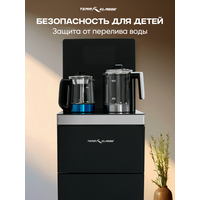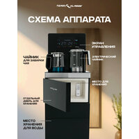 Напольный кулер с чайным столиком Team Klasse TK-A19 - тиабар с нижней загрузкой бутыли. Два чайника — для кипячения и заварки. Нагрев воды в чайнике до 100°С. Охлаждения воды нет. Шкафчик для хранения. Управление с помощью сенсорной панели управления на русском языке на столешнице. Верхняя часть представляет собой стойку с двумя кранами направленного типа, совмещенную с информационным дисплеем с индикацией работы аппарата. Функция регулировки температуры воды позволяет задавать нужную температуру воды в чайнике для кипячения в диапазоне от 45°С до 100°С. Функция энергосбережения включается через 5 мин, если аппарат не используется. Функция регулировки времени отключения подогрева заварочного чайника позволяет задавать режим постоянного подогрева чайника на 1-12 часов. Датчик отсутствия воды — при отсутствии воды в чайнике нагрев автоматически отключается. Датчик уровня воды — защита электрического чайника от перелива воды. В комплекте идет дистанционный пульт управления. Подача воды в чайник не требует открытия крышки. Нагрев воды в чайнике включается вручную. В верхней части корпуса есть шкафчик для хранения продуктов, у шкафчика и отсека для бутыли отдельные дверцы. Для экономии места поставляется в частично разобранном виде, перед использованием требуется сборка.