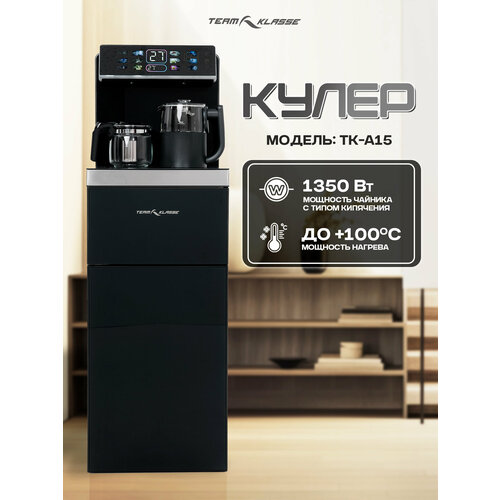 Напольный кулер с чайным столиком Team Klasse TK-A15 - тиабар с нижней загрузкой бутыли. Два чайника — для кипячения и заварки. Нагрев воды в чайнике до 100°С. Охлаждения воды нет. Шкафчик для хранения. Управление с помощью сенсорной панели управления на русском языке на столешнице. Верхняя часть представляет собой стойку с двумя кранами направленного типа, совмещенную с информационным дисплеем с индикацией работы аппарата. Функция регулировки температуры воды позволяет задавать нужную температуру воды в чайнике для кипячения в диапазоне от 45°С до 100°С. Функция энергосбережения включается через 5 мин, если аппарат не используется. Функция регулировки времени отключения подогрева заварочного чайника позволяет задавать режим постоянного подогрева чайника на 1-12 часов. Датчик отсутствия воды — при отсутствии воды в чайнике нагрев автоматически отключается. Датчик уровня воды — защита электрического чайника от перелива воды. В комплекте идет дистанционный пульт управления. Подача воды в чайник не требует открытия крышки. Нагрев воды в чайнике включается вручную. В верхней части корпуса есть шкафчик для хранения продуктов, у шкафчика и отсека для бутыли отдельные дверцы. Для экономии места поставляется в частично разобранном виде, перед использованием требуется сборка.