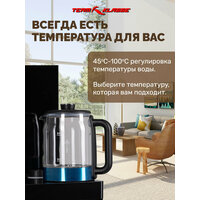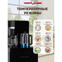 Напольный кулер с чайным столиком Team Klasse IP-YT932 - тиабар с нижней загрузкой бутыли. Два чайника — для кипячения и заварки. Нагрев воды в чайнике до 100°С. Шкафчик для хранения. Управление с помощью сенсорной панели управления на русском языке на столешнице. Верхняя часть представляет собой стойку с двумя кранами направленного типа, совмещенную с информационным дисплеем с индикацией работы аппарата. Функция регулировки температуры воды позволяет задавать нужную температуру воды в чайнике для кипячения в диапазоне от 45°С до 100°С. Функция энергосбережения включается через 5 мин, если аппарат не используется. Функция регулировки времени отключения подогрева заварочного чайника позволяет задавать режим постоянного подогрева чайника на 1-12 часов. Датчик отсутствия воды — при отсутствии воды в чайнике нагрев автоматически отключается. Датчик уровня воды — защита электрического чайника от перелива воды. В комплекте идет дистанционный пульт управления. Подача воды в чайник не требует открытия крышки. Нагрев воды в чайнике включается вручную. Правый кран подает воду непосредственно в чайник, левый кран — для подачи охлаждающей воды. В верхней части корпуса есть шкафчик для хранения продуктов, у шкафчика и отсека для бутыли отдельные дверцы. Для экономии места поставляется в частично разобранном виде, перед использованием требуется сборка.