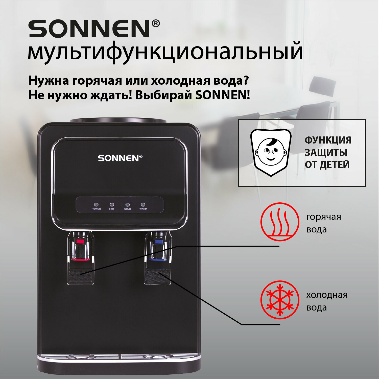Кулер для воды настольный с нагревом и охлаждением маленький, диспенсер с 2 кранами черный, Sonnen TSE-02WB, 456174: сравнение цен, характеристики, фото, актуальное наличие и цены.