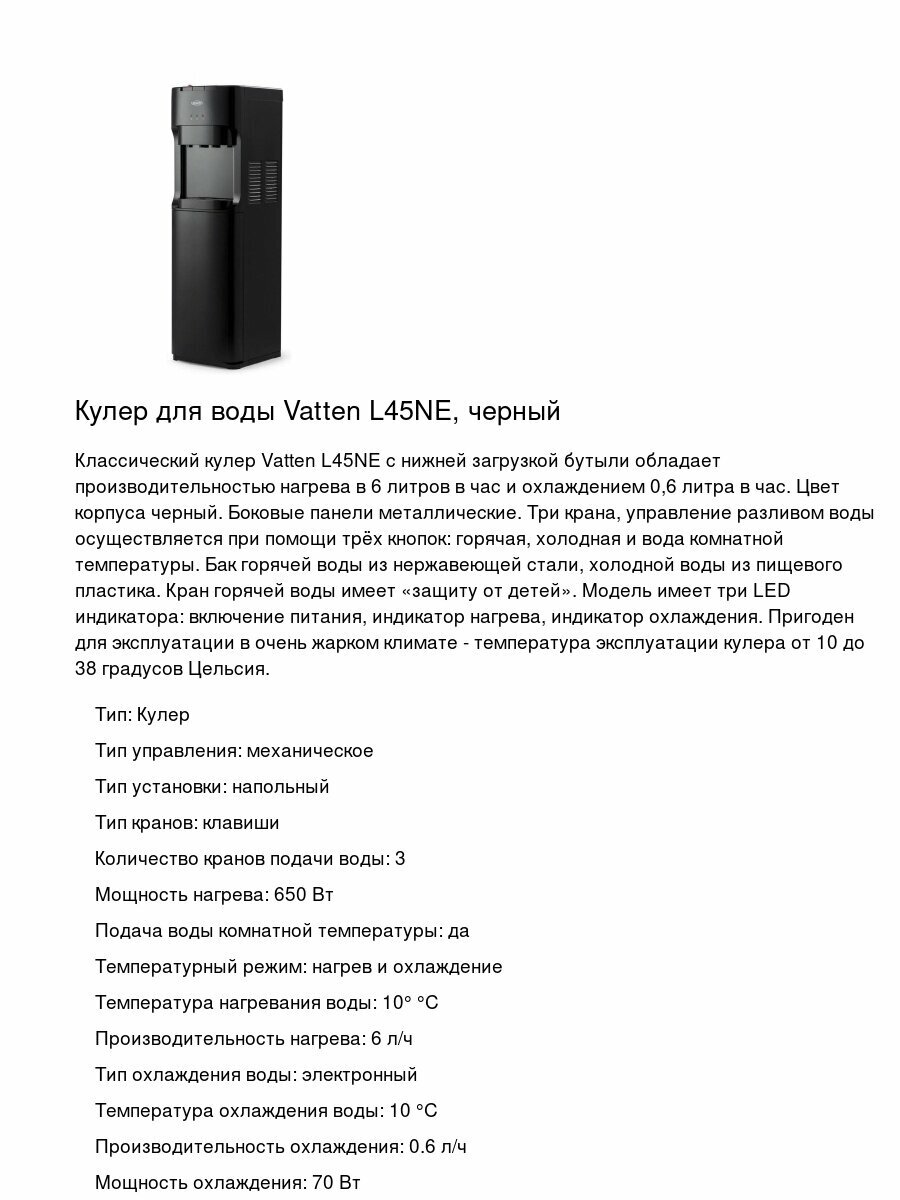 Купить Кулер для воды Vatten L45NE, черный с доставкой по всей России. Кулер для воды Vatten L45NE, черный: сравнение цен, характеристики, фото, актуальное наличие и цены.