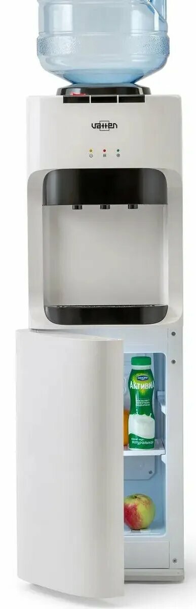 Напольный кулер для воды с нагревом и охлаждением + холодильник на 18л. Кулер для дома и офиса. Цвет белый. Три крана с кнопками. Подходит для домашнего и офисного использования, на предприятиях и учреждениях. Три LED индикатора (включение питания, индикатор нагрева, индикатор охлаждения - power, hot, frost).