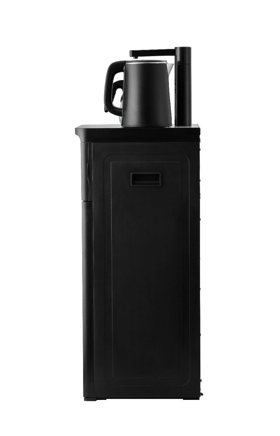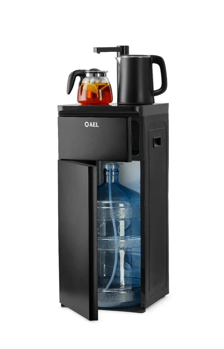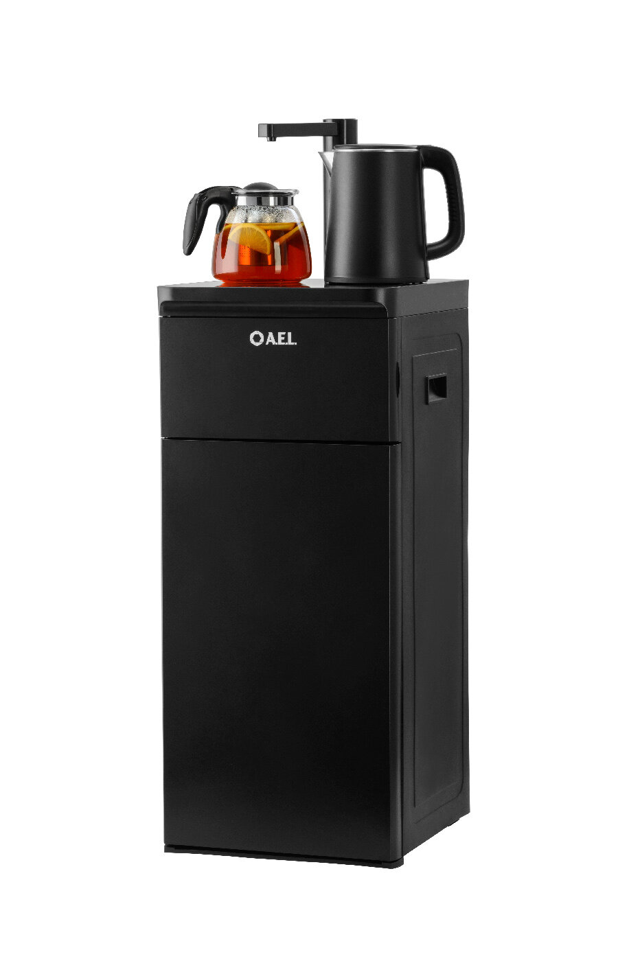 Кулер-тиабар с нижней загрузкой бутыли без охлаждения, состоит из заварочного и электрического чайников, сенсорной панели управления и шкафчика для хранения. Световая индикация и информативный дисплей на сенсорной панели сообщат о текущем режиме работы. Цвет черный. Чайники объемом 1 литр.