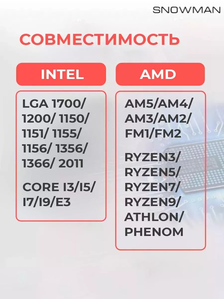 Все что необходдимо уже идет в наборе и ничего не надо искать! Подойдет для сокетов Intel 2011/1700/1200/1150/1151/1155/1156/1356/1366/775(i3/i5/i7/i9/E3), для AMD AM5/AM4/AM3/AM2/FM1/FM2 Крепление кулера на винтах.