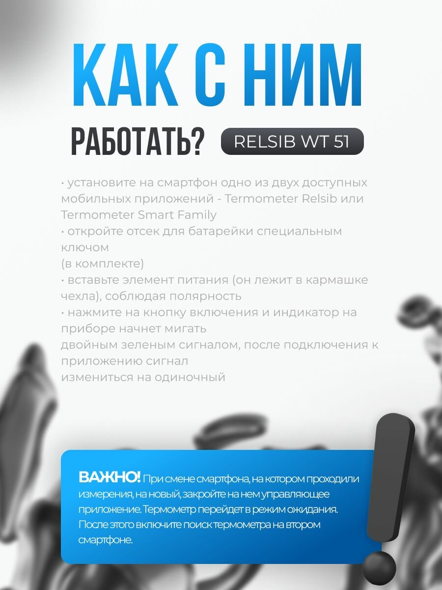 - Bluetooth-связь: передача измерений в реальном времени в мобильные приложения THERMOMETER SMART (iOS) и THERMOMETER RELSIB / SMART FAMILY / EСlerk (Android).