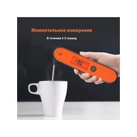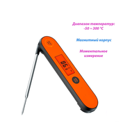 Скоростной цифровой термометр IHT-1P время отклика на температурный режим составляет 0.25 сек, с точностью ±1°C. Влагостойкий корпус термометра со степенью защиты IPX5 (до 90%) Корпус изготовлен из качественного пластика двух цветов. Чувствительный элемент изготовлен из безопасной пищевой, нержавеющей стали, способным открываться на 180 градусов. В корпусе скрываются мощные магниты, что позволяет крепить термометр к любым магнитящимся поверхностям. Термометр IHT-1P обладает функцией фиксации текущего значения температуры по Фаренгейт или по Цельсию, что удобно при измерении в положениях, когда дисплея не видно. Устройство имеет встроенную аккумуляторную батарею на 250 мАч, что равняется 11 часам беспрерывной работы. Для зарядки термометра предусмотрен кабель usb в комплекте.