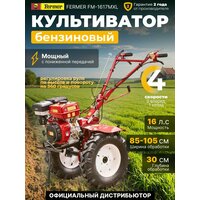Культиватор бензиновый мощный FM-1617MXL (FM-1617MXL-65) подходит для глубокой вспашки твердой почвы на больших площадях земли, универсальная сцепка поддерживает работу с различным навесным оборудованием: окучники, плоскорезы, фрезы, копалки, сеялки и плуги. Садовый мотокультиватор на колесах имеет мощный бензиновый двигатель 16 л. с, для высокой производительности и скорости обработки 8,5 соток/ч. Объем двигателя 420 см3, топливного бака 6 литров. Объем масла в редукторе 1,1 л. Садовая техника оснащена пониженной передачей, скорость вращения колесного вала при включенной пониженной передаче - всего 22 оборота в минуту. Пониженная скорость и высокий крутящий момент, идеально подходит для работы с плугом, окучником и прочими навесным оборудованием. 3 скорости движения вперёд и 1 скорость движения назад. Ширина обработки фрезами 105 см, глубина 30 см. (фрезы идут в комплекте). Культиватор для огорода оснащен модернизированной коробкой передач и сцеплением, для плавного начала движения, без рывков. Небольшой, устойчивый и комфортный в управлении, благодаря увеличенной массе 112 кг. Техника имеет отличное сцепление колес и оснастки с почвой для максимальной глубины фрезерования. Инструмент имеет шестеренчатый редуктор самый надежный, выносливый тип редуктора. Рыхлитель для огорода с колесами подходит для прополки сорняков, окучивания, рыхления почвы и множества других работ на дачном участке. Регулируемый руль и оптимальный центр тяжести обеспечат минимальную нагрузку на оператора. Межколёсное расстояние 60 см. Шестигранный вал редуктора 32 мм. Многодисковое сцепление. В комплекте колеса, втулки для колес, фрезы, защитные щитки, сошник, кронштейн сошника, набор крепежных изделий. Гарантийный срок 2 года.