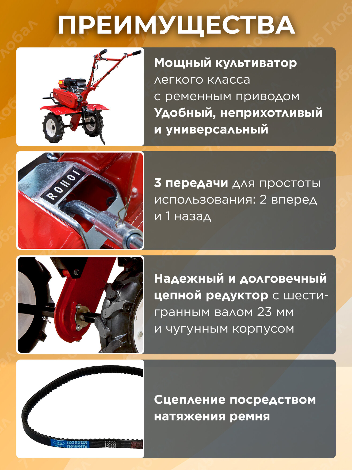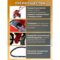 | Комплект поставки | Культиватор; колеса; основная секция фрез (три ряда ножей); дополнительная секция фрез (один ряд ножей); ограничительные диски для фрез; универсальная сцепка; сошник; съемный бампер; набор инструментов для монтажа; набор крепежных изделий |