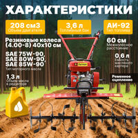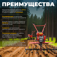 Культиватор бензиновый мощный FM-811MB (FM-811MB) легкого класса подходит для глубокой вспашки твердой почвы на больших площадях земли, универсальная сцепка поддерживает работу с различным навесным оборудованием: окучники, плоскорезы, фрезы, копалки, сеялки и плуги. Садовый мотокультиватор на колесах имеет мощный бензиновый двигатель 7,5 л. с, для высокой производительности и скорости обработки 4,5 соток/ч. Объем двигателя 208 см3, топливного бака 3,6 литров. Объем масла в редукторе 0,6 л. Садовая техника имеет 2 скорости движения вперёд и 1 скорость движения назад. Ширина обработки фрезами 95 см, глубина 30 см. (фрезы идут в комплекте). Культиватор для огорода оснащен модернизированной коробкой передач и сцеплением, для плавного начала движения, без рывков. Небольшой, устойчивый и комфортный в управлении, благодаря увеличенной массе 90 кг. Техника имеет отличное сцепление колес и оснастки с почвой для максимальной глубины фрезерования. Инструмент имеет цепной редуктор. Рыхлитель для огорода с колесами подходит для прополки сорняков, окучивания, рыхления почвы и множества других работ на дачном участке. Регулируемый руль и оптимальный центр тяжести обеспечат минимальную нагрузку на оператора. Межколёсное расстояние 60 см. Шестигранный вал редуктора 32 мм. Многодисковое сцепление. В комплекте колеса, втулки для колес, фрезы, защитные щитки, сошник, кронштейн сошника, набор крепежных изделий. Гарантийный срок 2 года.