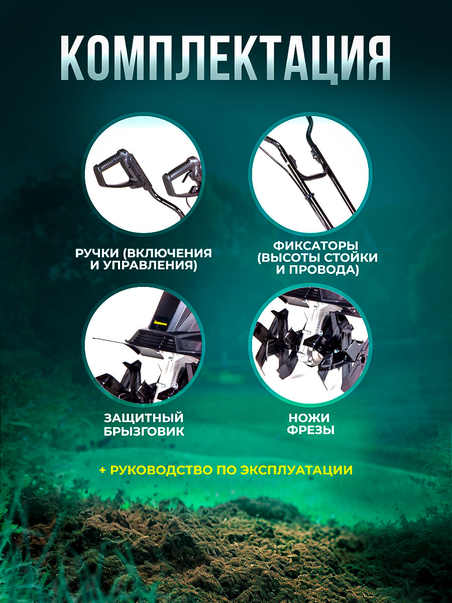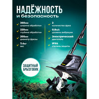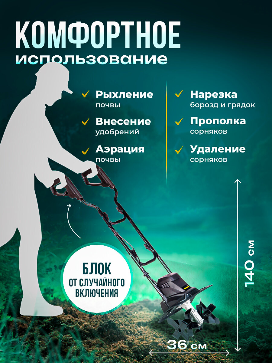 Глубина вспашки составляет 22 см, ширина - 36 см. Мощный электрический двигатель 1000 Вт работает от сети и является очень тихим и не наносит вреда окружающей среде.
