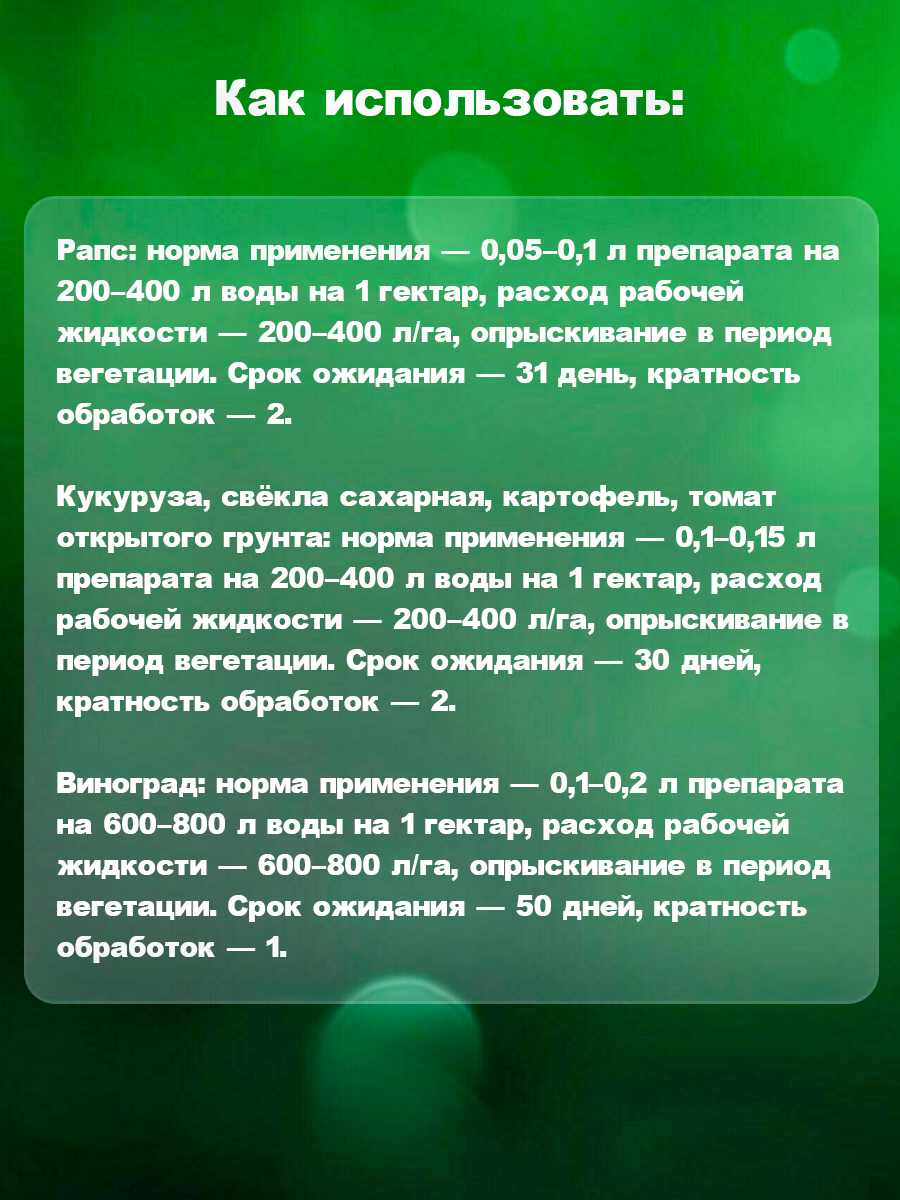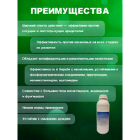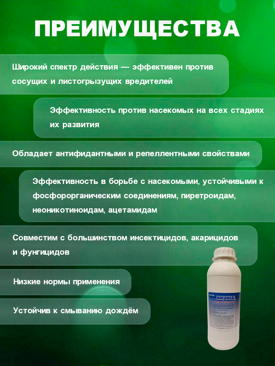 Преимущества: Широкий спектр действия, Акарицидная активность, Эффективен против насекомых на всех стадиях их развития, Высокая скорость воздействия, Обладает антифидантными и репеллентными свойствами, Низкие нормы применения. Спектр действия: Американская белая бабочка, блошки, галлицы, долгоносики, жуки, капустная белянка, капустная моль, клещи, клопы, колорадский жук, комарики, кукурузный мотылек, листоблошки, листовертки, луговой мотылек, мухи, пилильщики, плодожорки, пьявицы, рапсовый цветоед, саранчовые, совки, толстоножки, трипсы, цикадки, яблонный цветоед.