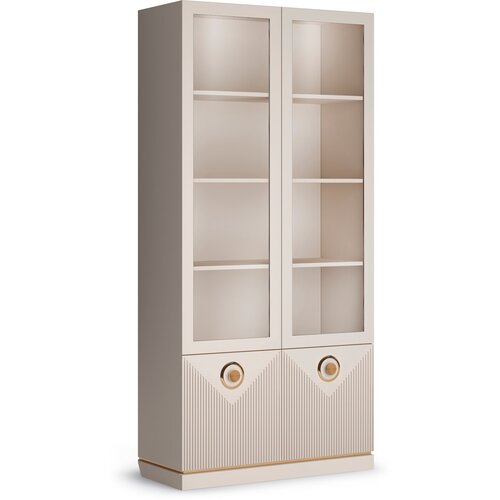 Вашему вниманию предлагается большая вместительная витрина из коллекции «Капри». Модуль выполнен в стиле модерн и имеет яркий дизайн - гармоничное сочетание пастельных кремовых оттенков с яркой и нарядной фурнитурой, декоративной фрезеровкой фасадов и золотой кромкой над цоколем делают образ мебели незабываемым.
