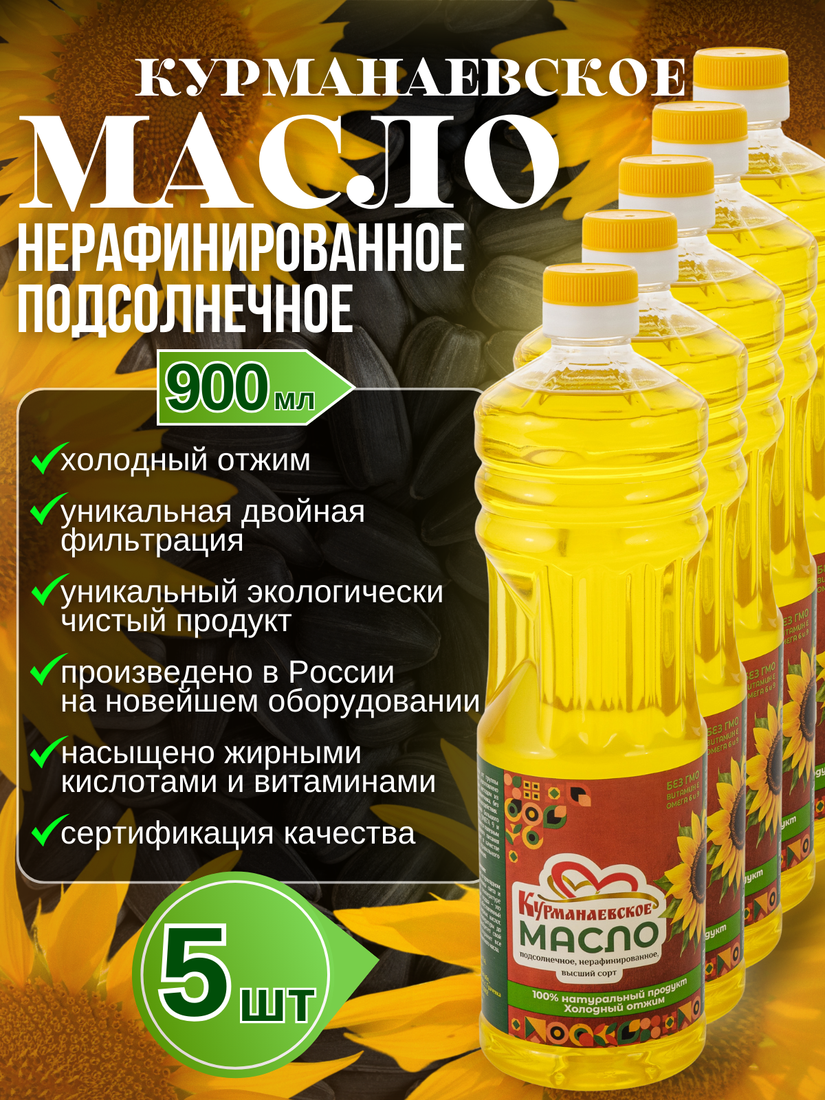 Курманаевское подсолнечное нерафинированное масло — 0,9 л, 5 бутылок растительного масла двойной фильтрации: сравнение цен, характеристики, фото, актуальное наличие и цены.