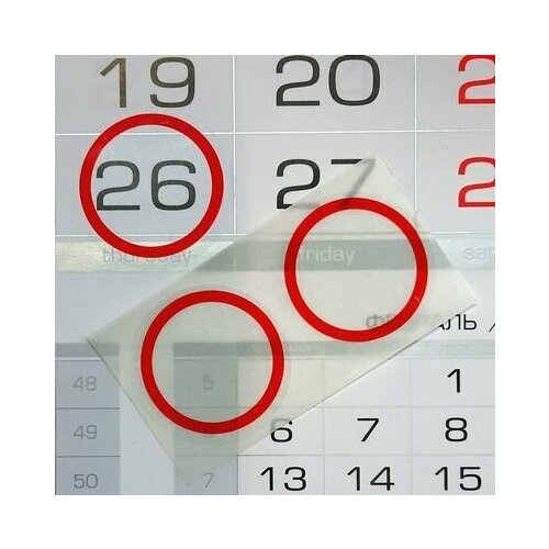 Круглый курсор диаметром 36 мм с красным ободком - идеальное решение для отметок в календаре. Изготовлен из статической пленки, он хорошо держится на мелованных, цифровых видах гладких бумаг благодаря статическому электричеству.