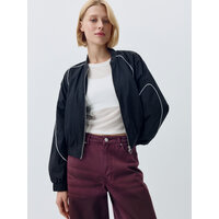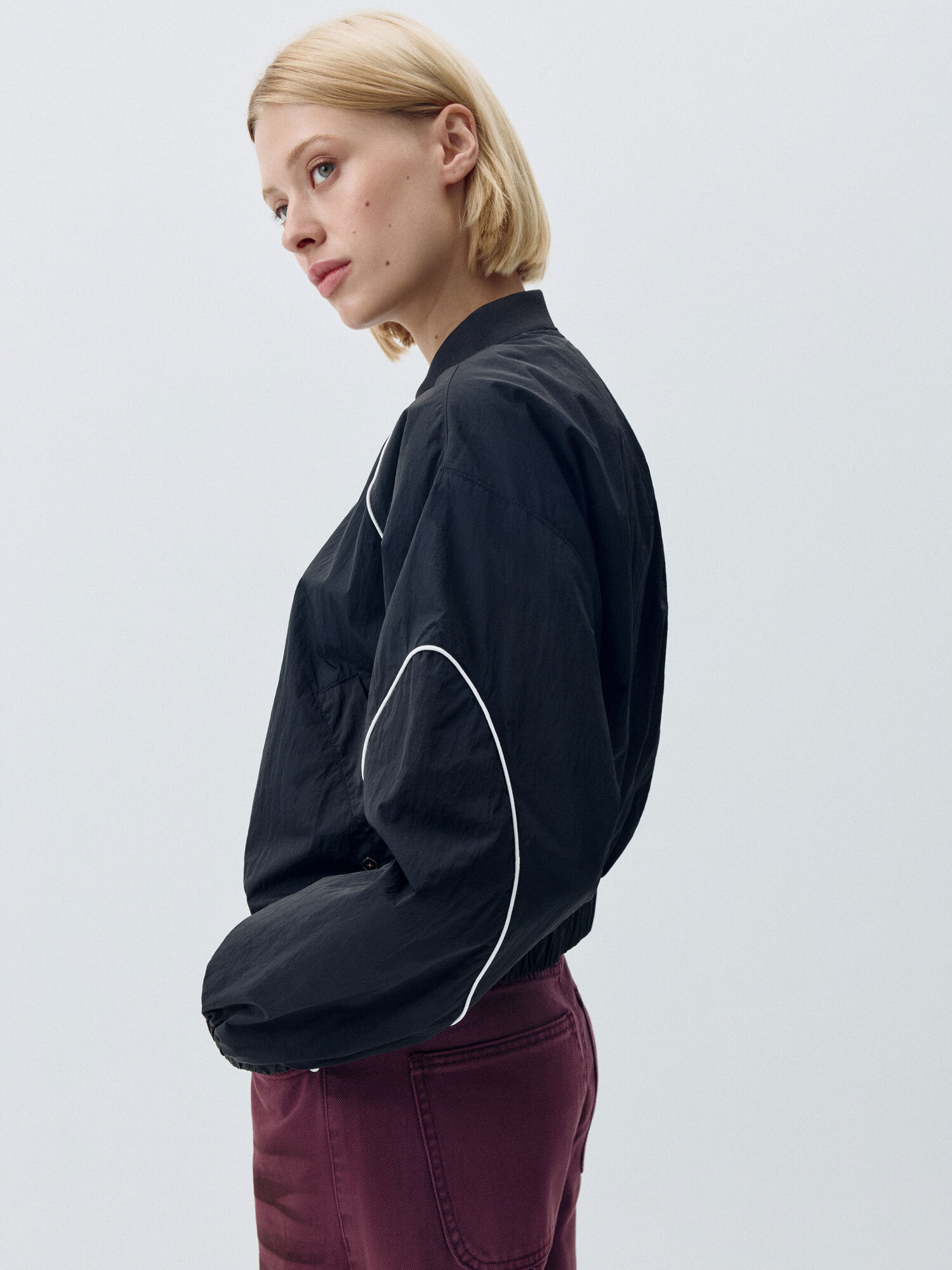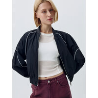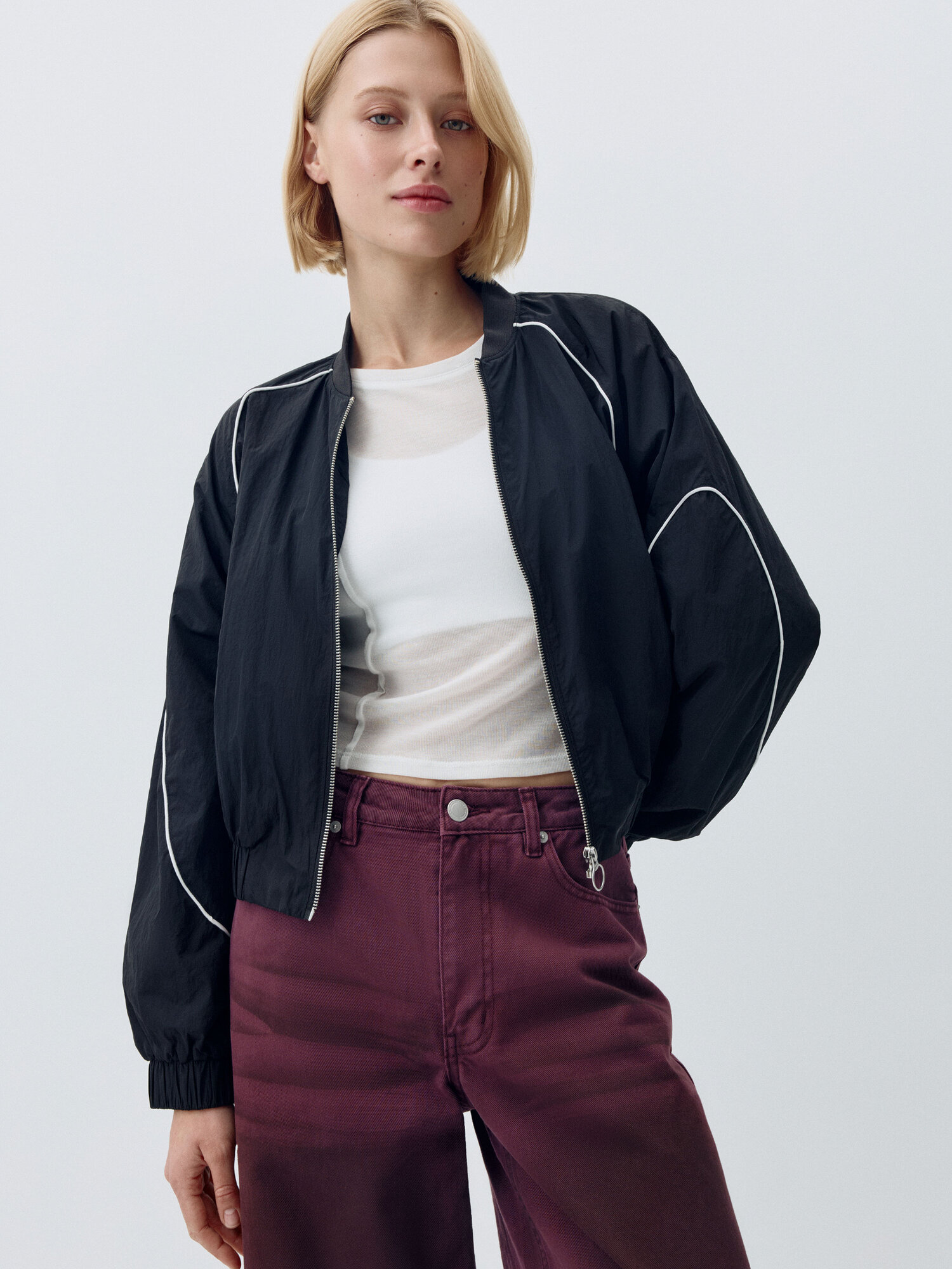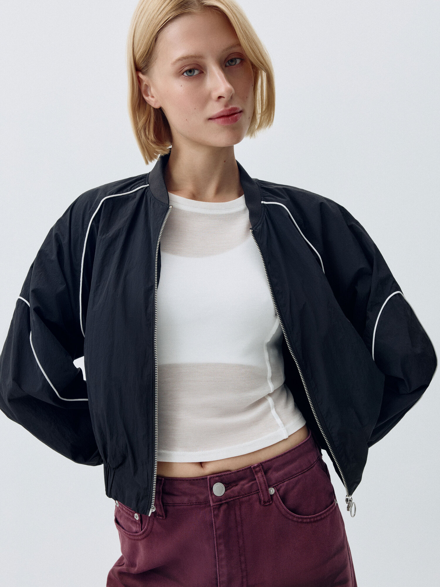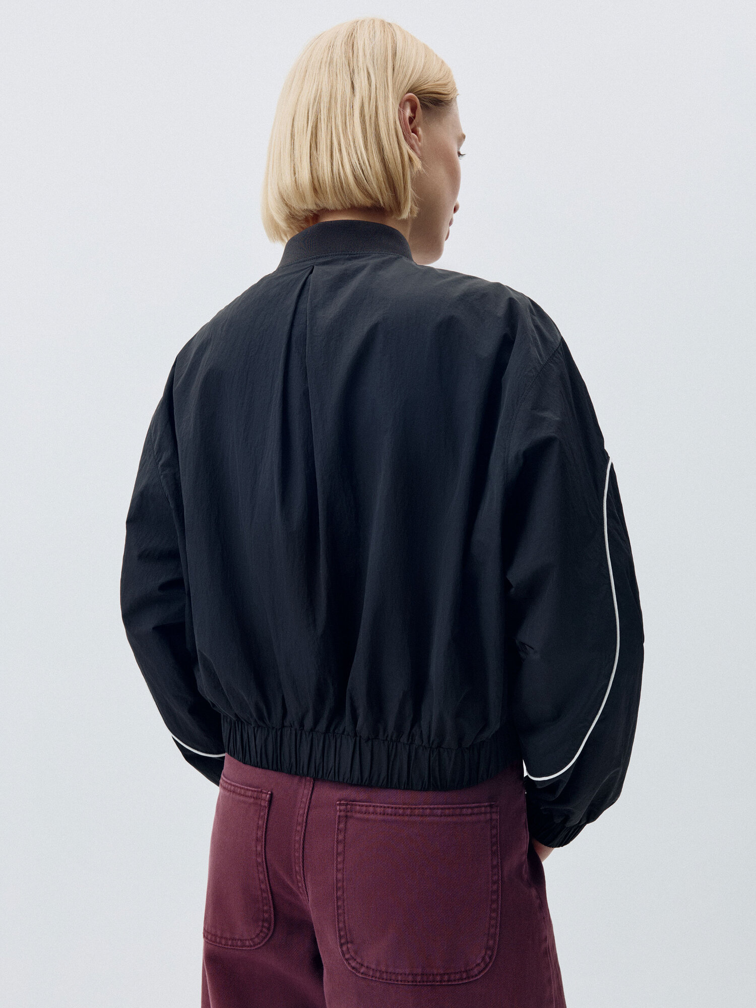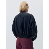 Короткая легкая ветровка в спортивном стиле с контрастными кантиками. Фактурная нейлоновая ткань с водоотталкивающей пропиткой. Свободный прямой крой с объемными длинными рукавами реглан и складкой на спинке. Низкий трикотажный воротник, прорезные карманы и металлическая застежка-молния. Эластичные манжеты и подол для лучшего прилегания и предотвращения поддувания. Рекомендованный температурный режим: +10/+20. В коллекции представлены брюки в тон арт. 4808011527.