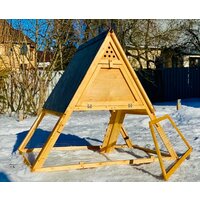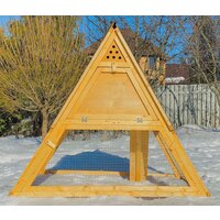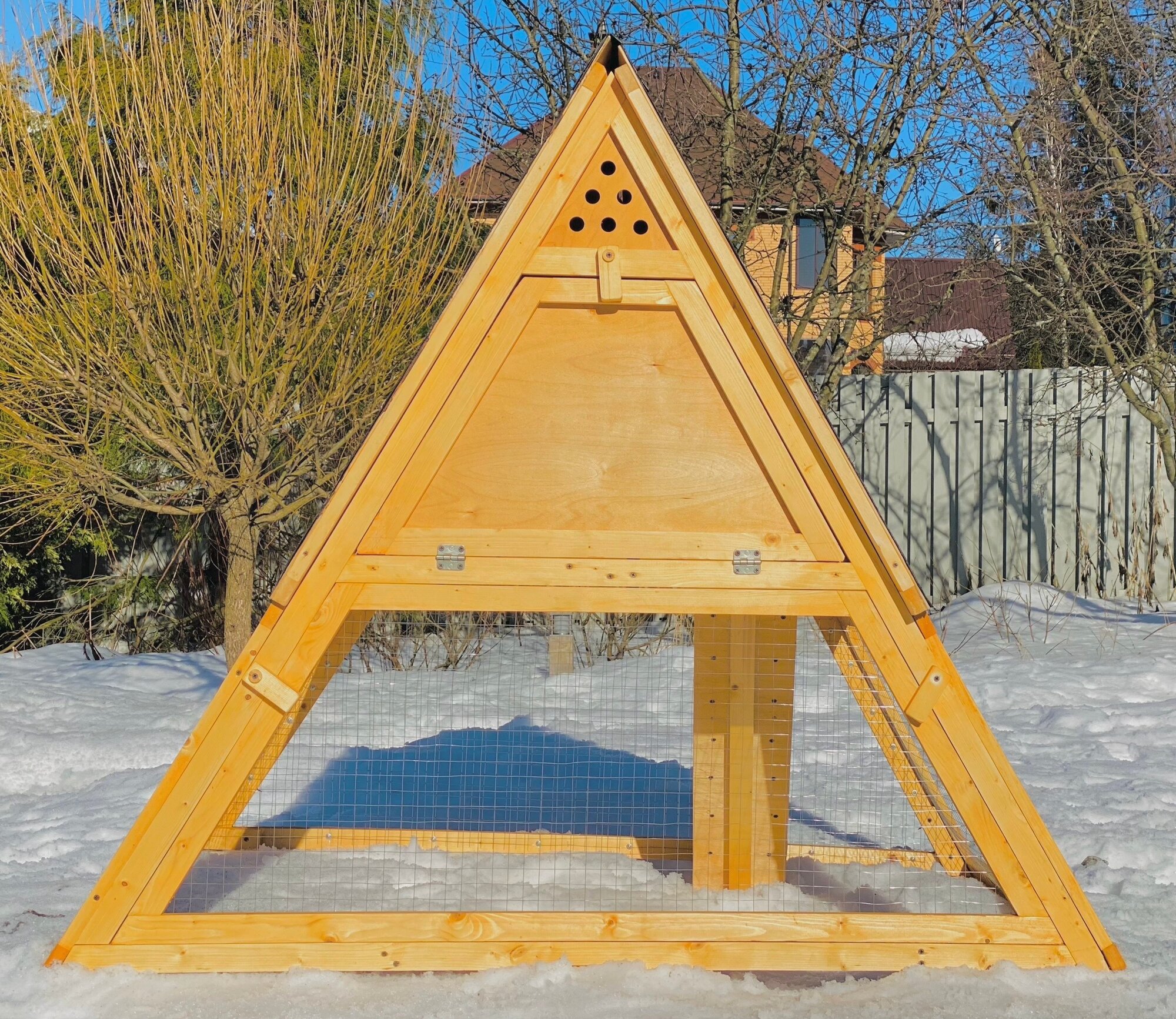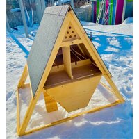 Верхний ярус - домик для сна и гнездования. В домике 2 съемных насеста. Гнездо поделено на 2 отсека. Дверцы с двух сторон курятника обеспечивают максимально удобное обслуживание и забор яиц. Из домика в выгул предусмотрен съемный трап, по которому курам удобно спускаться и подниматься. Есть затвор, для того чтобы кур можно было закрывать на ночь в домике.