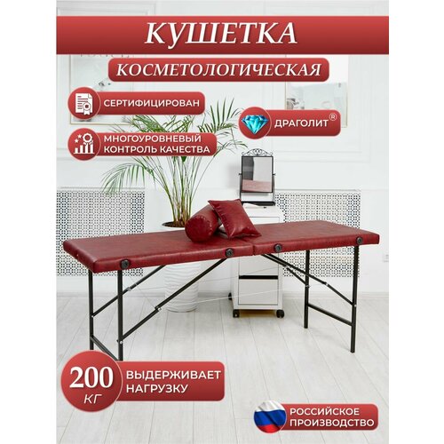 Ножки выполнены из стального профиля с заглушками для защиты покрытия, на котором устанавливается кушетка. Кушетка косметологическая сделана из искусственной кожи российских производителей, что позволяет ей увеличить срок службы в отличие от аналогичных предложений. Кожа легко обрабатывается спецсредствами и имеет высокую плотность.