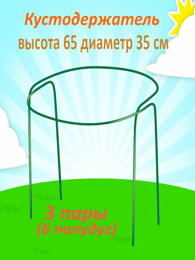 Кустодержатель садовый металлический состоит из полудуг высотой 65 см, диаметром 35 см. - количество в комплекте указано на фото. Подпорка под кусты выполнена из трубы стальной электросварной диаметром 10 мм с пвх-покрытием для избежания коррозии. Опора для садовых растений подходит для кустов смородины, крыжовника, гортензий, роз, пионов, георгинов, других цветов и кустов. Опора для кустов и цветов позволяет формировать растения желаемой формы, делать их аккуратными и компактными. В зависимости от размера куста вы можете использовать несколько подпорок. Поддержка для растений крепко и бережно поддержит ветви плодовых и декоративных растений, заботливо выращиваемых Вами в саду или огороде, не давая им опускаться до земли. Кустодержатель для смородины и крыжовника легко крепится в рыхлый грунт, в плотный грунт не втыкайте, проделывайте ямки в земле колышком. Нас ищут: кустодержатель для смородины, опора для смородины, подпорка для гортензий, кустодержатель для крыжовника, кустодержатель круглый, полудуги, кустодержатель металлический, подпорка для цветов, подпорка под кусты, подпорка для пионов, опора для роз.