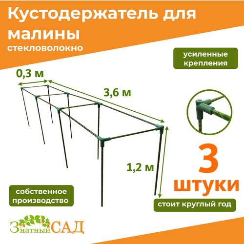 Кустодержатель для малины «Знатный сад» предназначен для поддержания одного ряда малины длиной 3,6 метра. Можно использовать для цветов, декоративных кустов и так далее. Ограждения изготовлены из стеклопластикового волокна, что делает их очень прочными и долговечными. Срок службы изделий из данного материала составляет более 10 лет.