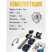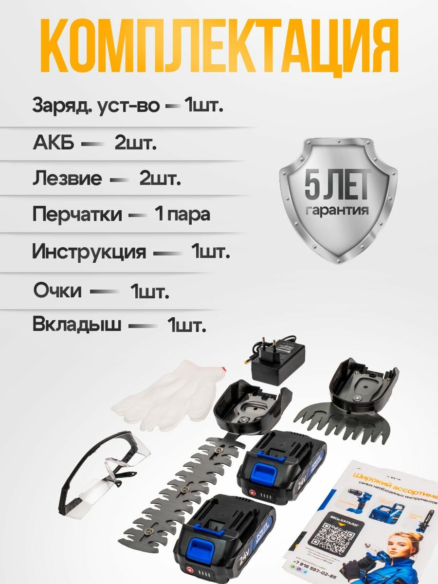 В комплект поставки входят сам кусторез, две аккумуляторные батареи, блок питания , насадка для травы, насадка для кустов, защитные очки и перчатки.