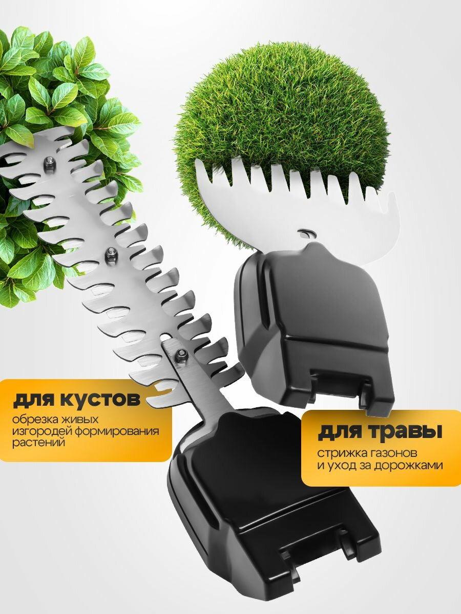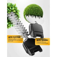 Кусторез оборудован защитой от случайного пуска, системой регулировки угла наклона и индикатором уровня заряда, что делает его использование не только удобным, но и безопасным. Инструмент легко адаптируется под разные задачи благодаря сменным насадкам -для травы и для кустов.