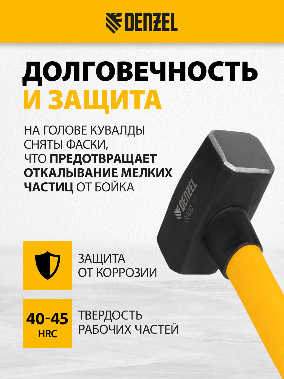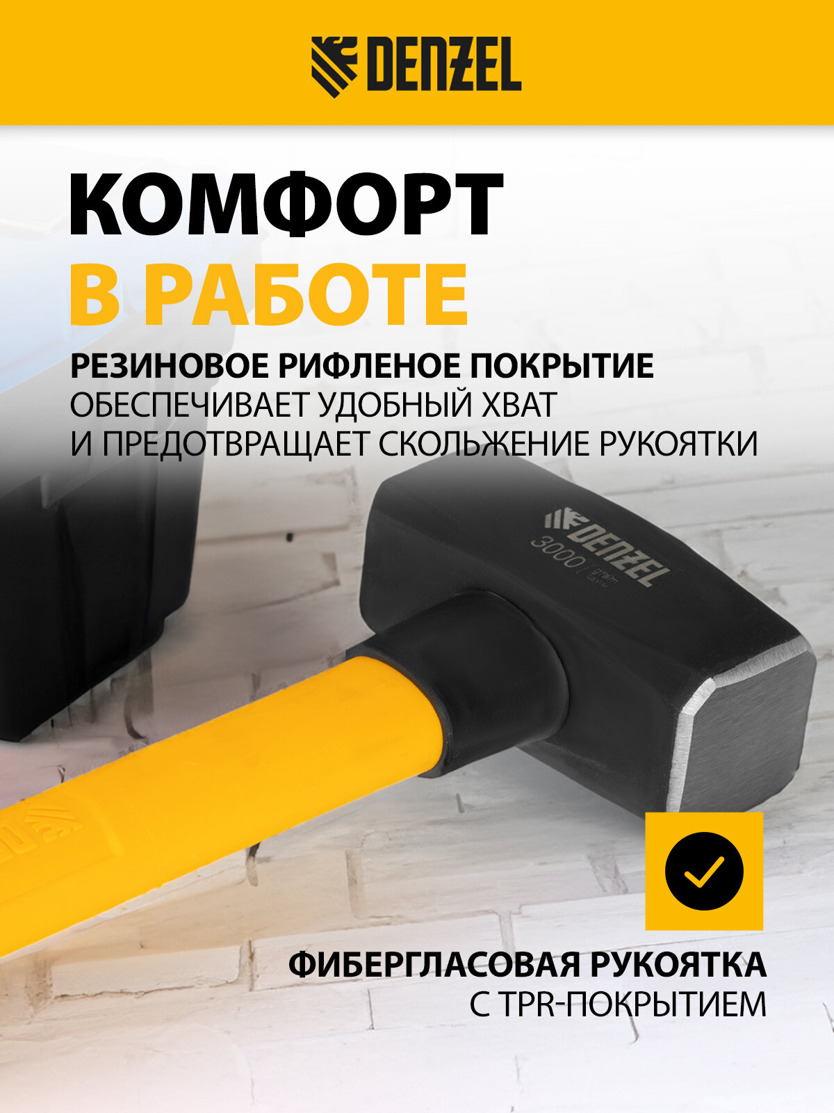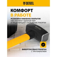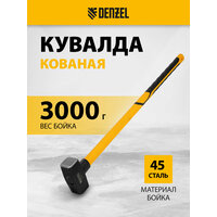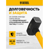 Кованая кувалда Denzel 11022 с бойком весом 3000 г и фибергласовой обрезиненной рукояткой длиной 880 мм, с TPR покрытием, предназначена для проведения демонтажных работ: разрушения кирпичной кладки, камня и бетона, забивания клиньев, кольев, скоб и других тяжелых ударных работ. Удлиненная рукоятка позволяет наносить удары большой силы, а кованый боек отличается прочностью и не подвержен деформациям.
