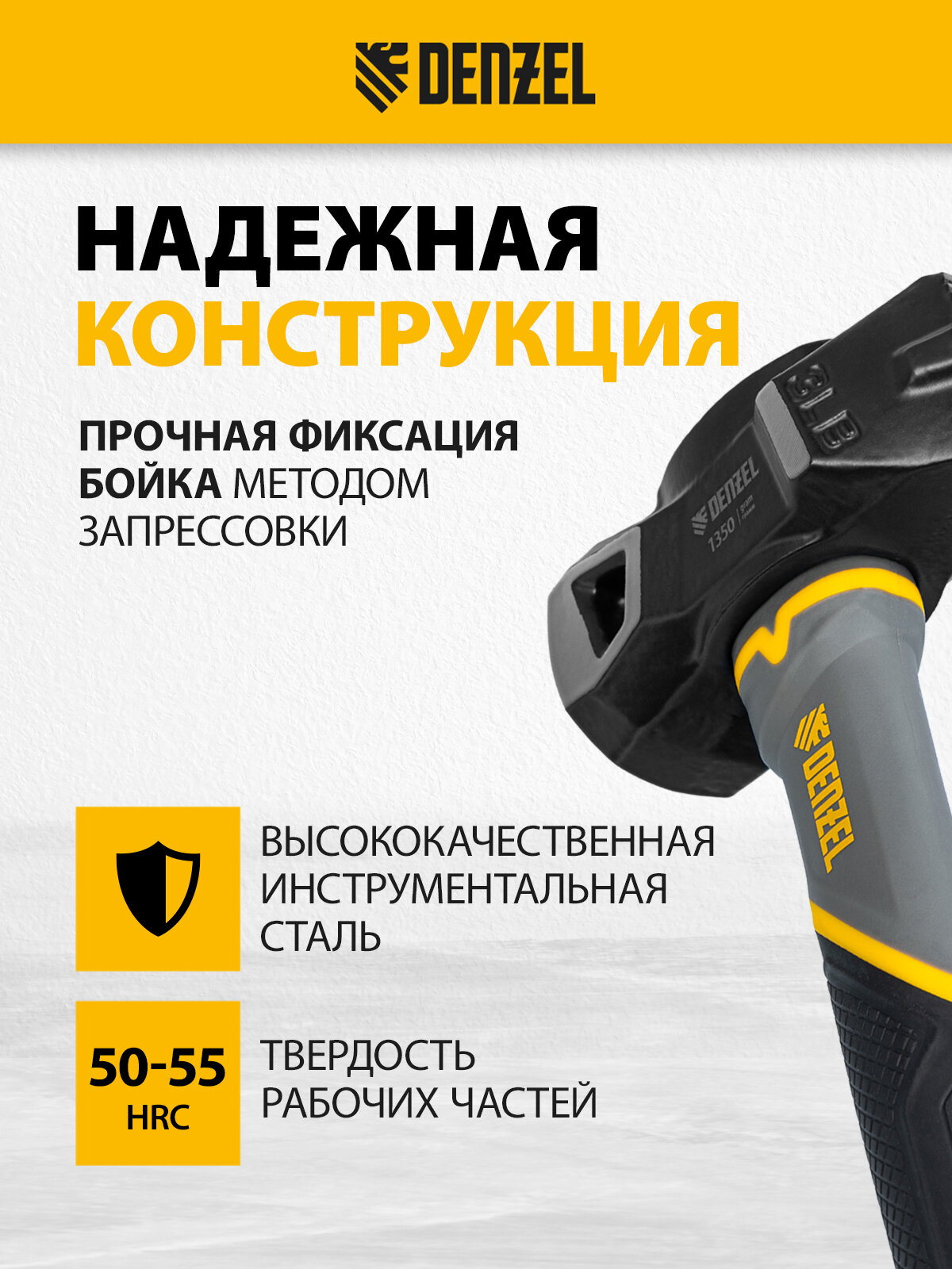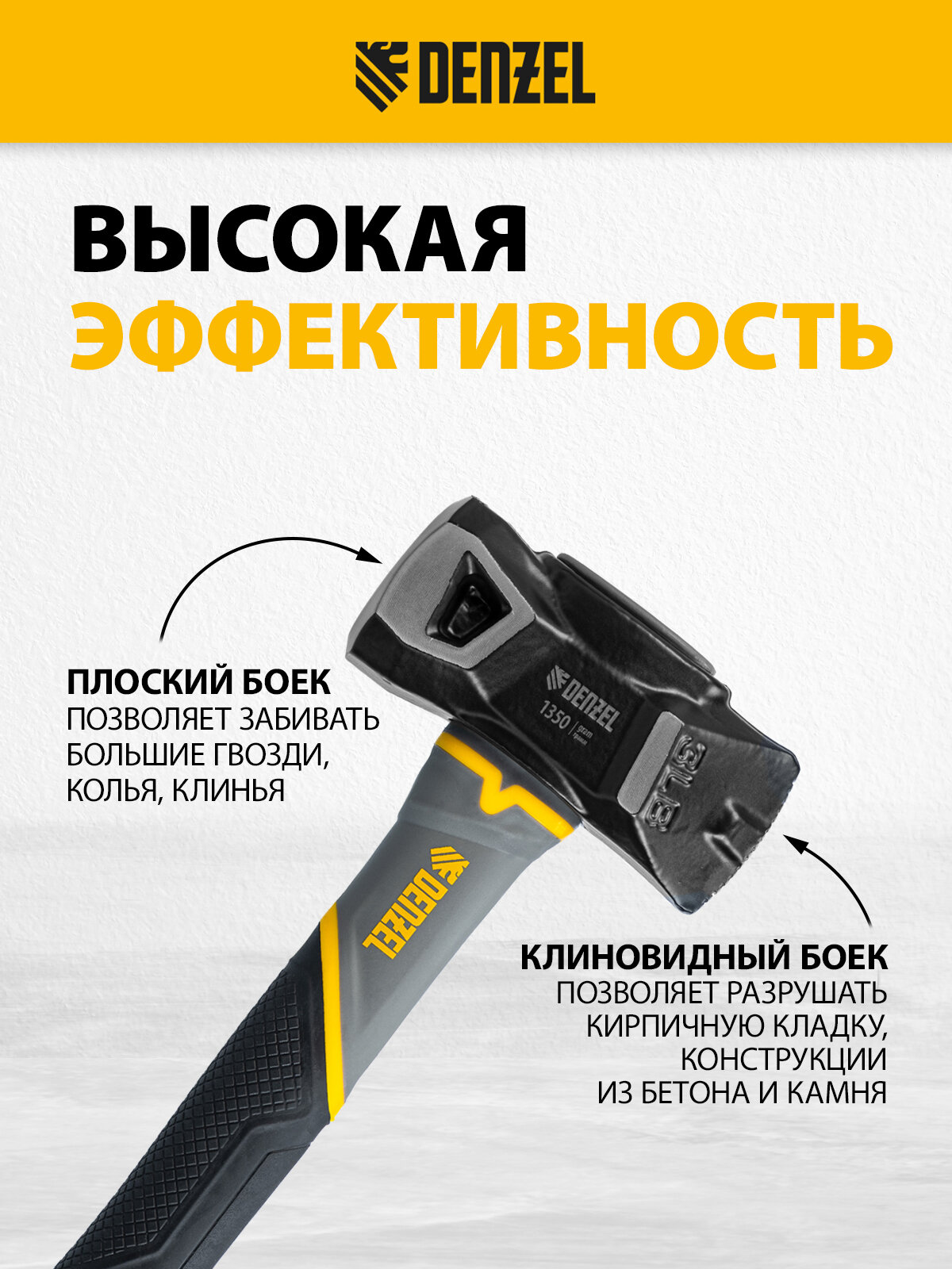 Кувалда Denzel 11015 с клиновидным бойком весом 1,35 кг и фибергласовой рукояткой с TPR-покрытием предназначена для нанесения ударов. Две рабочие зоны делают ее универсальной в работе: клиновидный боек позволяет разрушать кирпичную кладку, конструкции из бетона и камня, а плоский боек — забивать большие гвозди, колья, клинья и выполнять другие ударные работы. Инструмент также подходит для сгибания и придания формы металлическим деталям. Используется при проведении слесарных, строительных и кузовных работ, подойдет и для бытового применения.