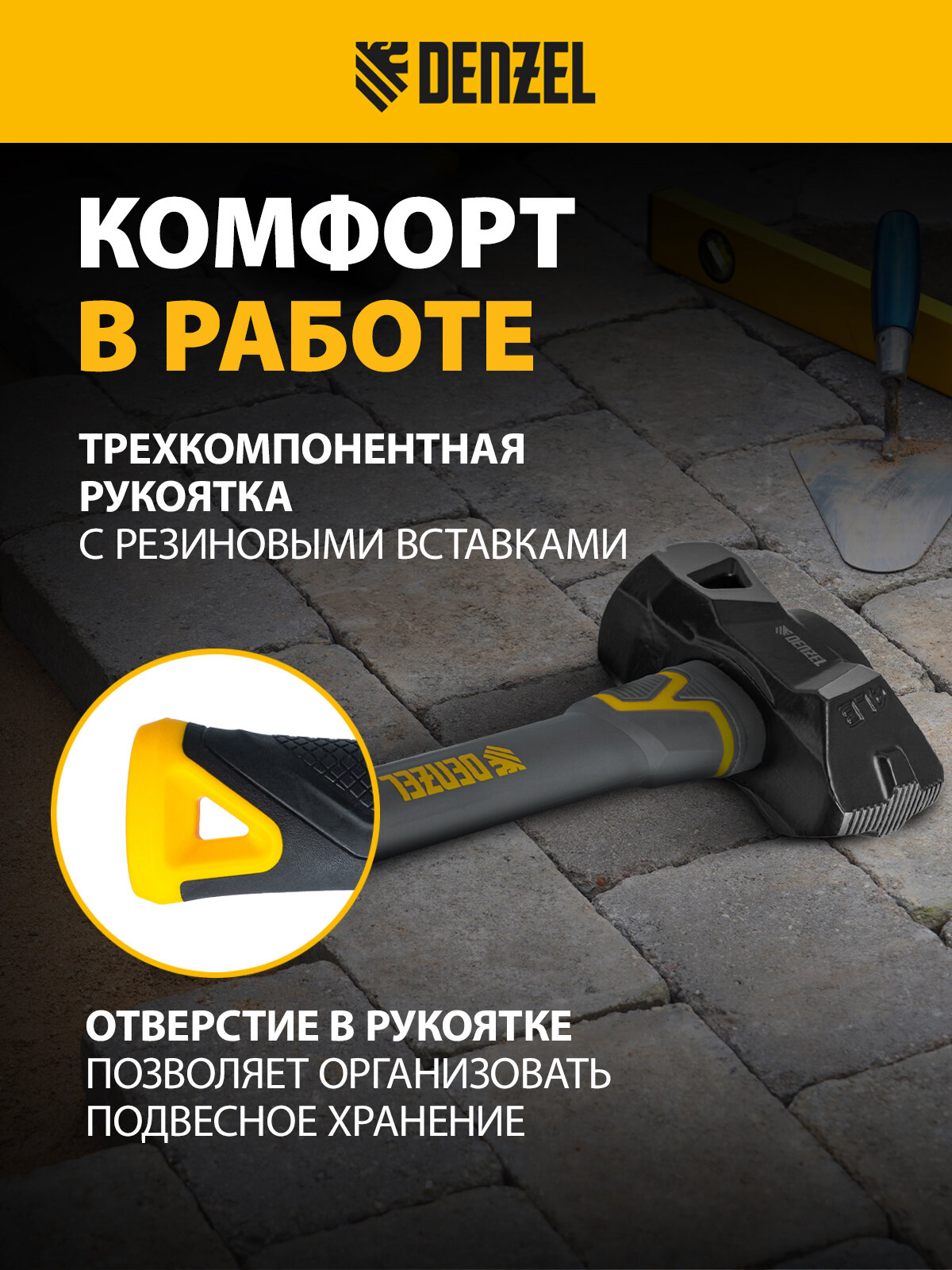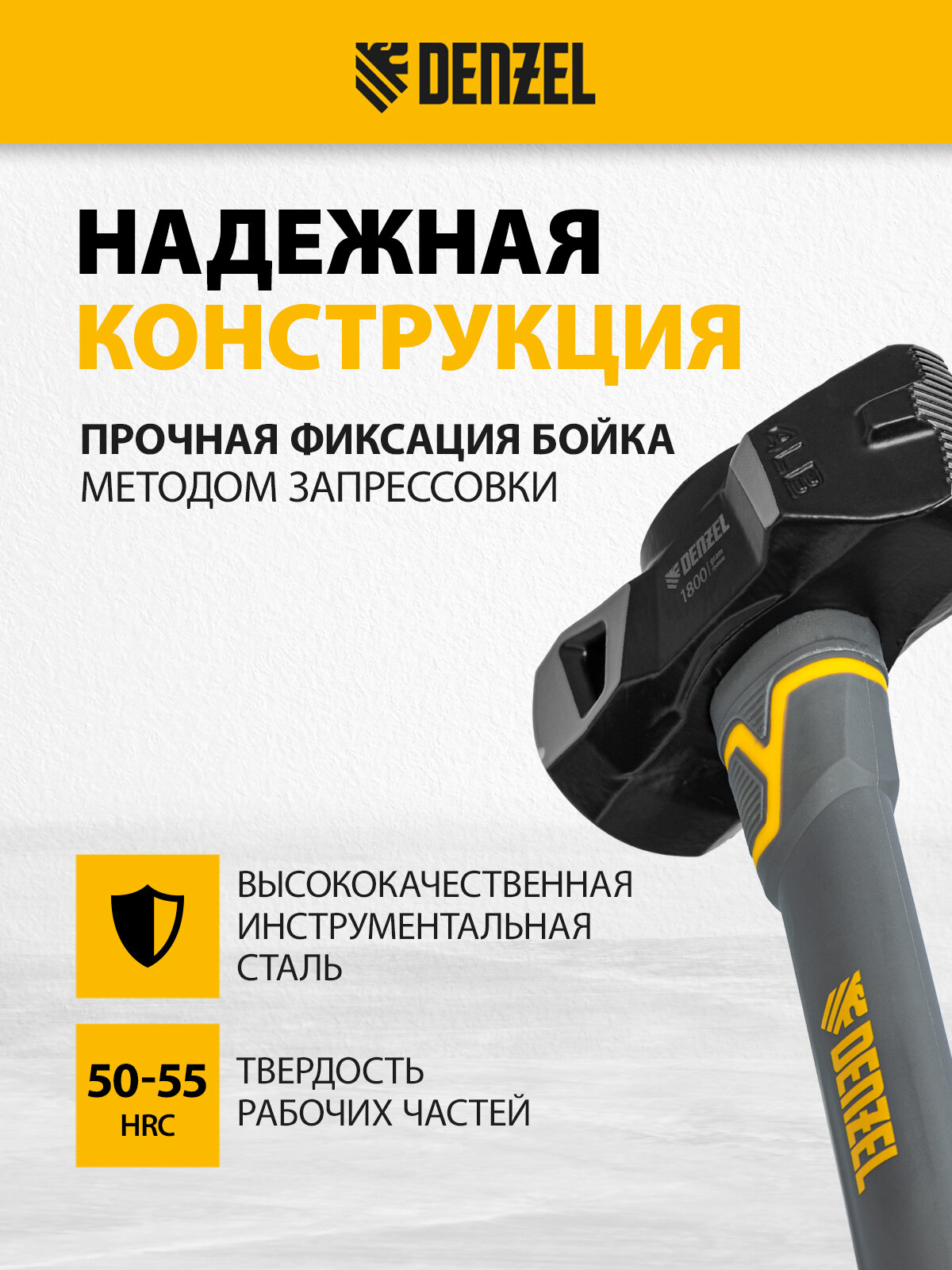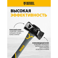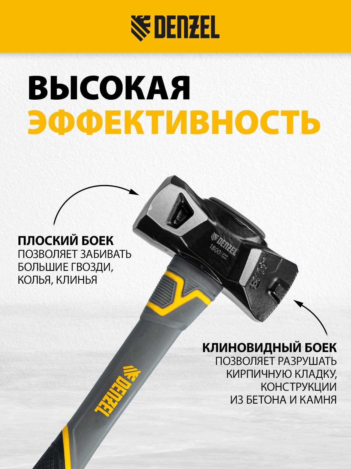 Кувалда Denzel 11016 с клиновидным бойком весом 1,8 кг и фибергласовой рукояткой с TPR-покрытием предназначена для нанесения ударов. Две рабочие зоны делают ее универсальной в работе: клиновидный боек позволяет разрушать кирпичную кладку, конструкции из бетона и камня, а плоский боек — забивать большие гвозди, колья, клинья и выполнять другие ударные работы. Инструмент также подходит для сгибания и придания формы металлическим деталям. Используется при проведении слесарных, строительных и кузовных работ, подойдет и для бытового применения.