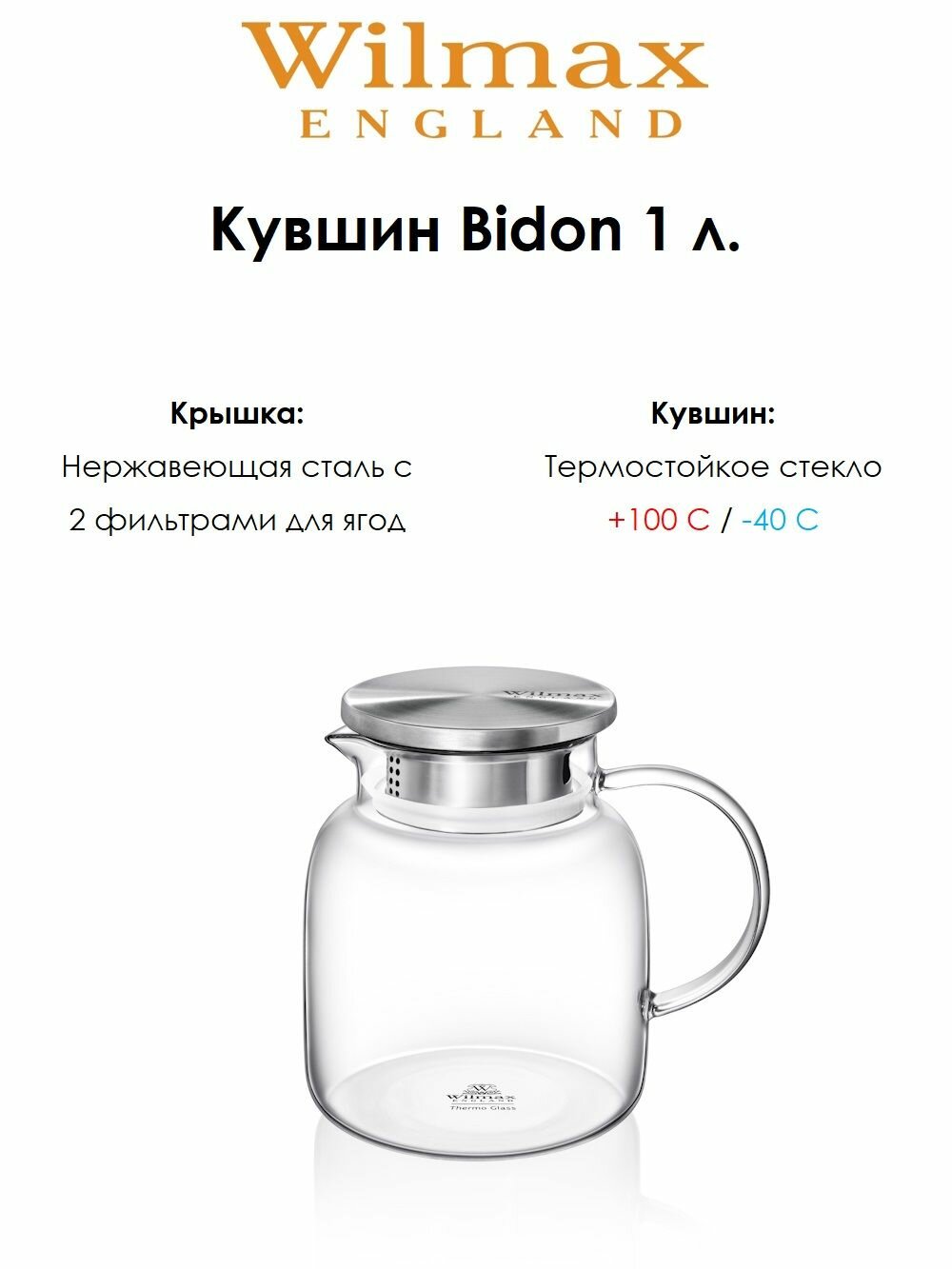 Купить Кувшин стеклянный Bidon 1 л. (крышка металл с фильтром). Wilmax с доставкой по всей России. Кувшин стеклянный Bidon 1 л. (крышка металл с фильтром). Wilmax: сравнение цен, характеристики, фото, актуальное наличие и цены.