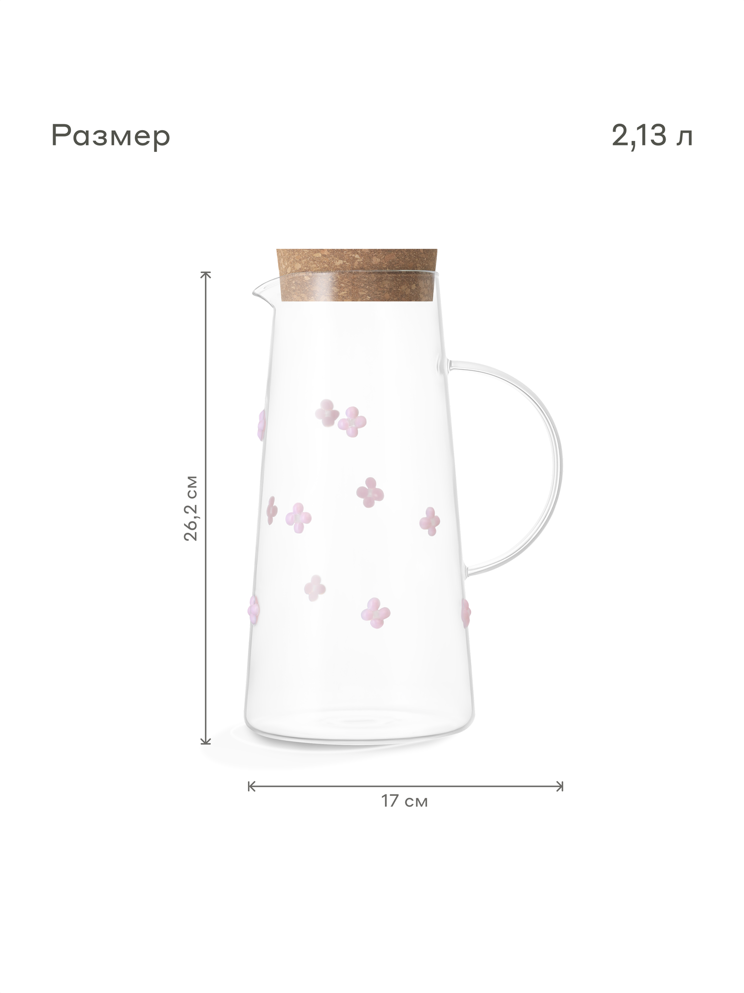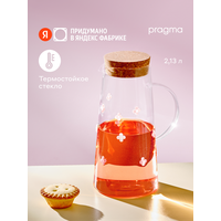Pragma — это бренд эстетичных и функциональных решений для дома, придуманный в Яндекс Фабрике. ㅤ Кувшин Pragma Opoko объёмом 2,13 л сделан из боросиликатного термостойкого стекла, устойчивого к перепадам температуры от 0 до 120 °. Прочный материал сохраняет прозрачность и подходит для подачи как горячих, так и холодных напитков. ㅤ Кувшин выполнен вручную и украшен фактурным рисунком с цветочками — каждый экземпляр уникален. Крышка из натуральной пробки плотно прилегает и помогает дольше сохранить аромат напитка. ㅤ Кувшин можно мыть в посудомоечной машине без крышки.
