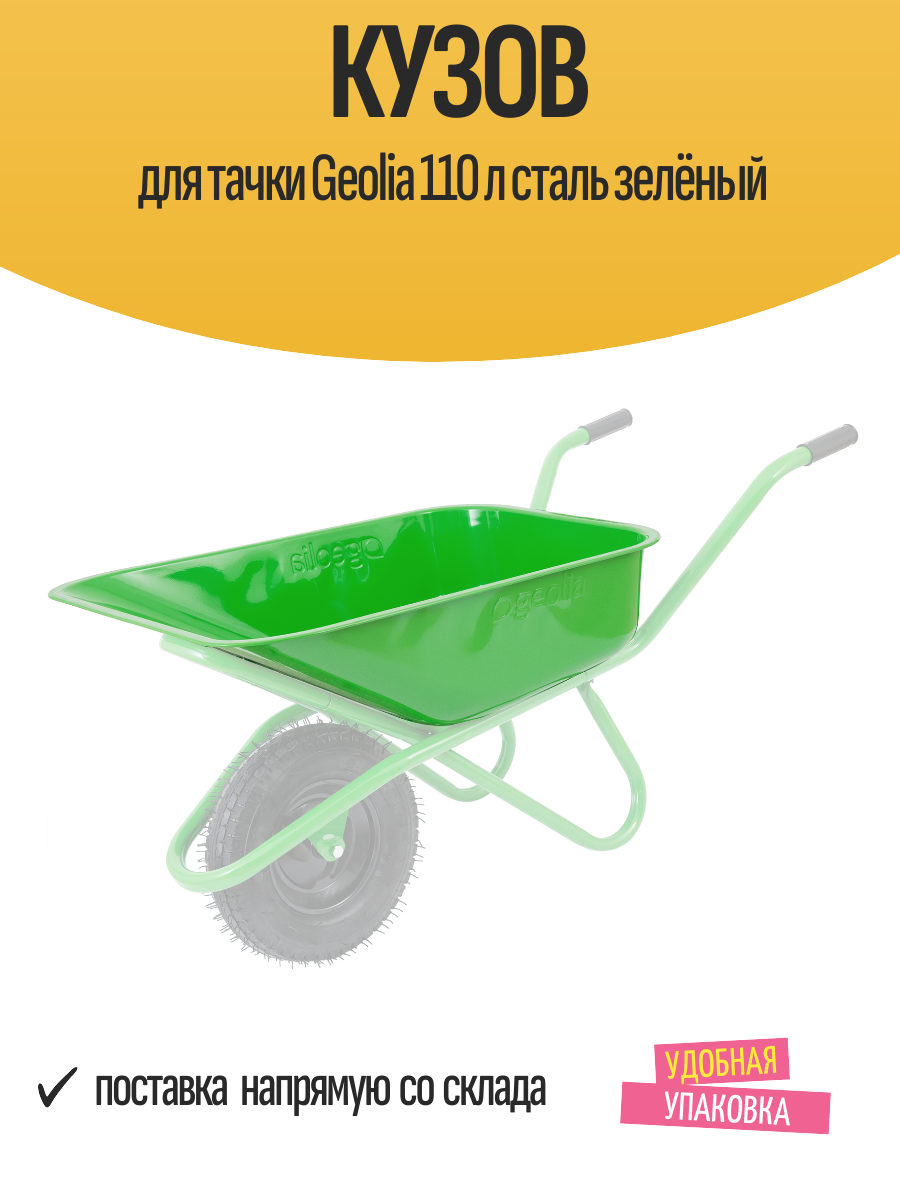 Кузов для тачки Geolia 110 л сталь зелёный изготовлен из оцинкованной стали толщиной 0,7мм и дополнительно окрашен – что защищает метал от коррозии.