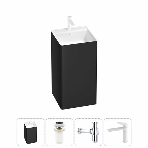 Купить Квадратная напольная раковина для ванной Wellsee Pure BY Wellsee 20213293R в наборе 4 в 1: напольная отдельностоящая раковина моноблок (чаша белый глянец, стенки матовый черный), донный клапан, сифон, смеситель (цвет матовый белый) с доставкой по всей России.