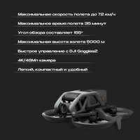| Дополнительная информация | 1. DJI Avata совместим с очками DJI Goggles 2, DJI FPV Goggles V2, DJI FPV Remote Controller 2 и DJI Motion Controller. 2. Угол обзора 155° доступен только при соотношении сторон 4:3 и спецификации записи видео 2,7K@50/60fps или 1080p@50fps/60fps; соотношение сторон составляет 16:9, а характеристики видеозаписи — 4K при 50/60 кадрах в секунду, 2,7K при 50/60 кадр |
