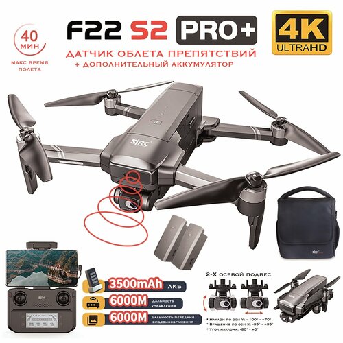 Квадрокоптер SJRC F22 S2 PRO+ 2 АКБ OAS 2-AXIS 4K EIS 5G GPS - F22 S2 PRO+ COMBO - это обновленная версия, которая получила новейшую Ultra HD (4k) камеру с передачей видео до 6000 м, которая установлена на 2-х осевом подвесе. За счет этого видео будет плавным, без рывков и отклонений. Дальностью полета теперь увеличена до 6000 м. Удобный складной форм-фактор позволит удобно перевозить и хранить коптер. Время полета до 80 минут за счет 2 аккумуляторов, которые идут в комплекте.