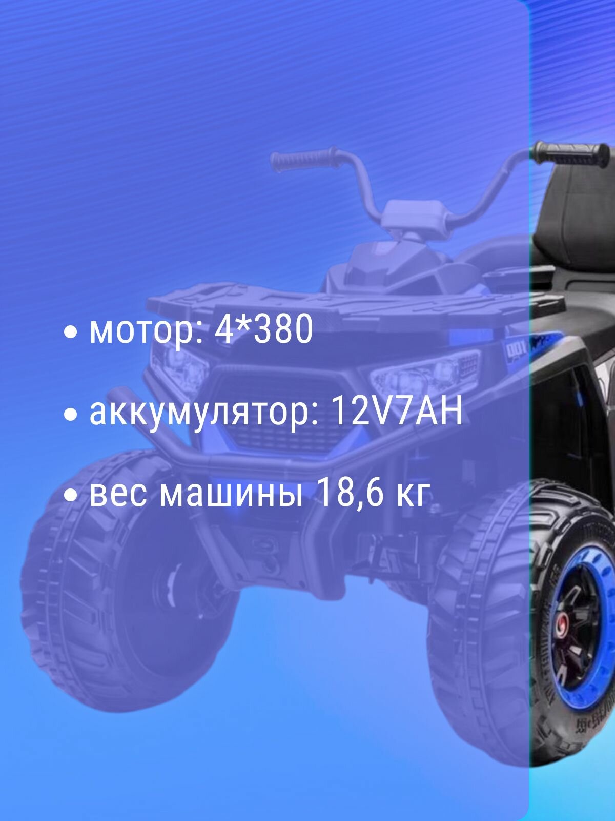 Электромобиль детский на аккумуляторе: идеальный подарок для вашего ребенка! Подарите своему ребенку незабываемые моменты радости и приключений с нашим электромобилем! Этот стильный и мощный детский электромобиль создан для детей в возрасте от 2 до 12 лет и станет настоящим другом в увлекательных поездках по двору, парку или на даче. Основные характеристики: • Мощный мотор 4*380: обеспечивает отличную скорость и маневренность, позволяя вашему ребенку легко справляться с любыми препятствиями. • Аккумулятор 12V7AH: гарантирует длительное время игры без подзарядки, чтобы ваш малыш мог наслаждаться каждой минутой на свежем воздухе. • Пульт дистанционного управления: для родителей, которые хотят контролировать поездку своего ребенка и обеспечивать его безопасность. • Светодиодные фонари: яркое освещение добавляет стиль и безопасность, позволяя кататься даже в сумерках. • Сиденья из экокожи: обеспечивают комфорт и легкость в уходе, а также придают автомобилю современный вид. • EVA колеса: обеспечивают отличное сцепление и плавный ход, делая поездки безопасными и комфортными. Этот электромобиль — не просто игрушка, а целый мир приключений, который поможет развивать у вашего ребенка координацию, уверенность в себе и навыки управления. Идеальный подарок на день рождения или любой другой праздник! Не упустите возможность сделать своего ребенка счастливым!