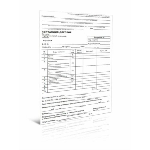 Подробнее о печати с переменными серией и номером см. здесь Форма бланка "Квитанция-договор на услуги мотелей, кемпингов, гостиниц" разработана в соответствии с Постановлением Правительства РФ от 06.05.2008 г. N 359 В случае, когда у частных предпринимателей (малых компаний), предоставляющих населению различные услуги нет кассового аппарата, они могут выдавать вместо него БСО. Об этом гласит вторая статья второй пункт Федерального закона РФ от 22.05.2003 года (№ 54 Ф3). На бланках строгой отчетности оформляются предназначенные для осуществления наличных денежных расчетов и (или) расчетов с использованием платежных карт без применения контрольно-кассовой техники в случае оказания услуг населению квитанции, билеты, проездные документы, талоны, путевки, абонементы и другие документы, приравненные к кассовым чекам.