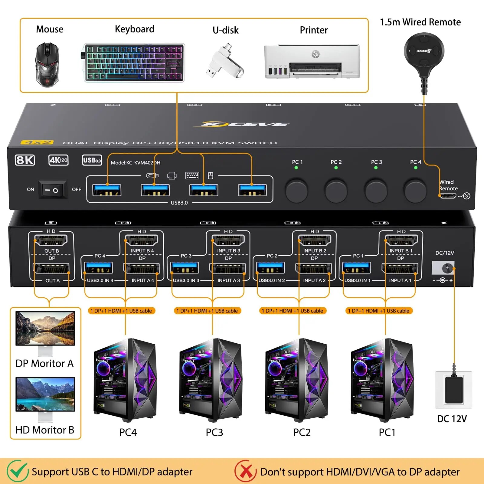 KVM-переключатель, 4 ПК, 2 монитора, HDMI Displayport, 8K @ 60 Гц, 4K при 144 Гц, KVM-переключатель USB 3.0 для 4 ПК для клавиатуры, мыши и принтера, EU POWER PLUG: сравнение цен, характеристики, фото, актуальное наличие и цены.
