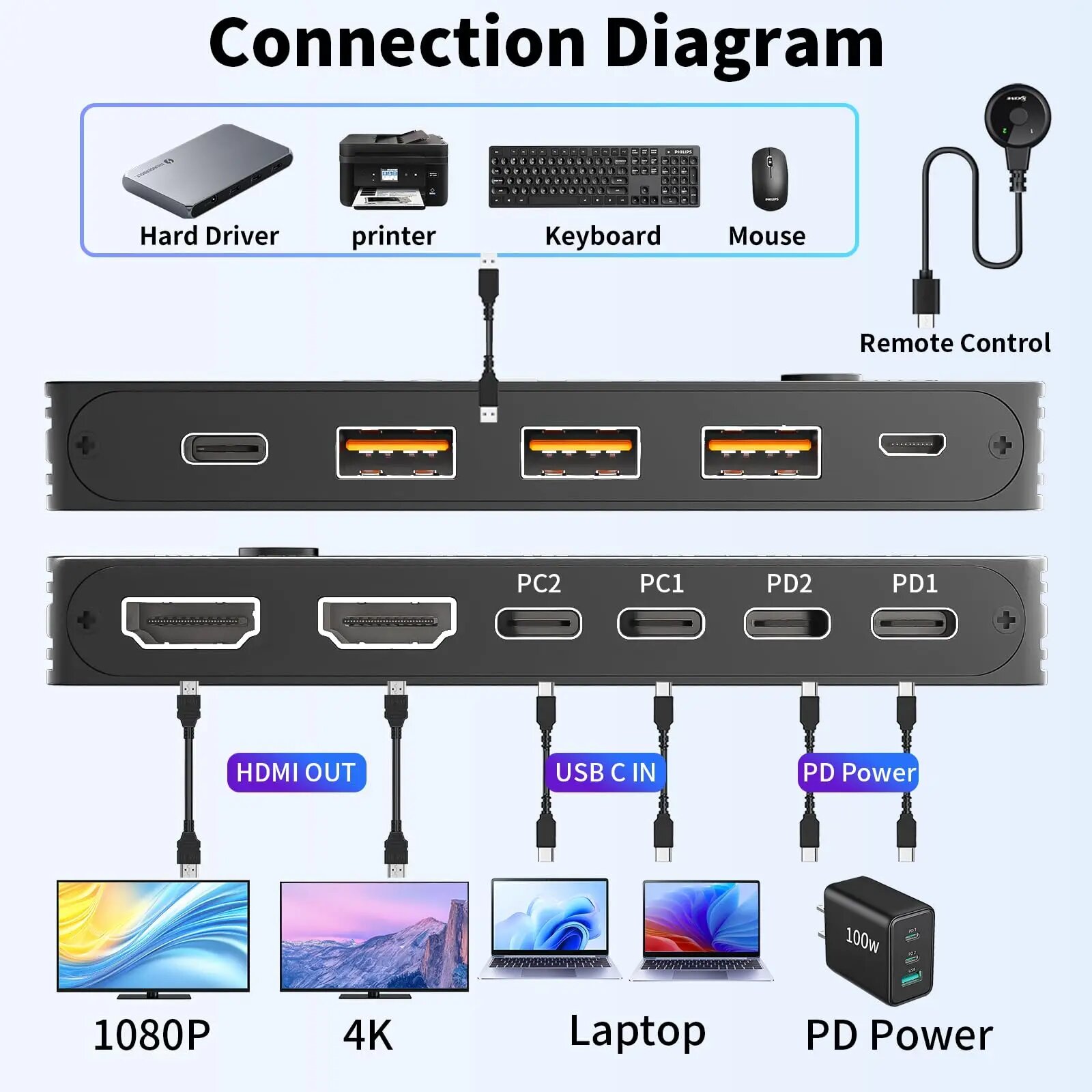 KVM-переключатель 4K/1080P при 60 Гц, KVM-переключатель с двумя мониторами USB C для 2 совместных с ноутбуками, 2 монитора и 10 Гбит/с, 4 устройства USB3.0, USB C Switch: сравнение цен, характеристики, фото, актуальное наличие и цены.