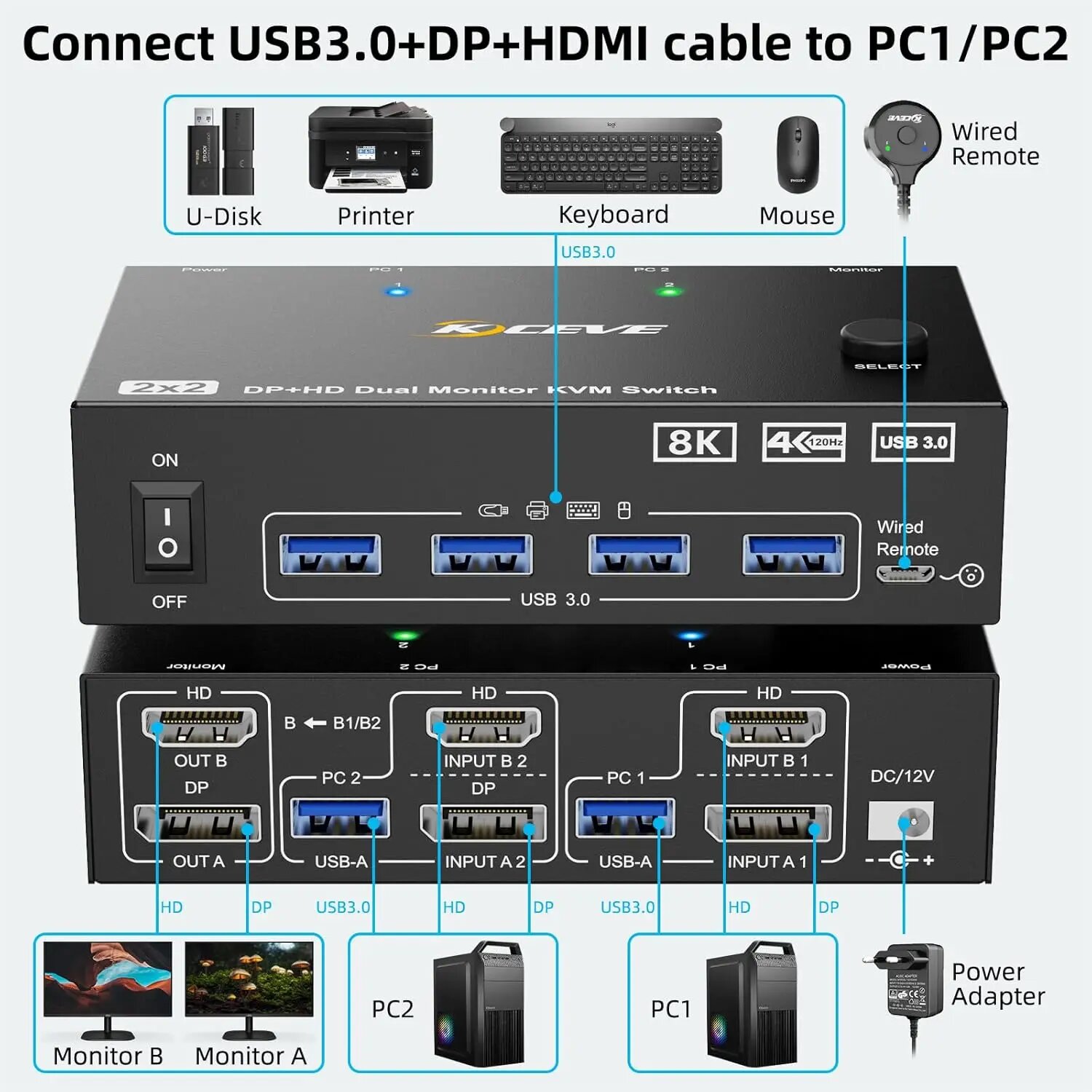 KVM-переключатель 8K, 2 монитора, 2 компьютера, Displayport HDMI, двойной монитор, KVM-переключатель USB 3.0 DP, поддержка 8K при 60 Гц для 2 компьютеров, KC-KVM8202DH-EU: сравнение цен, характеристики, фото, актуальное наличие и цены.