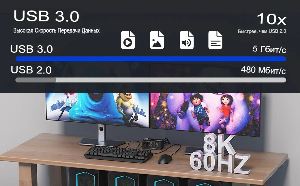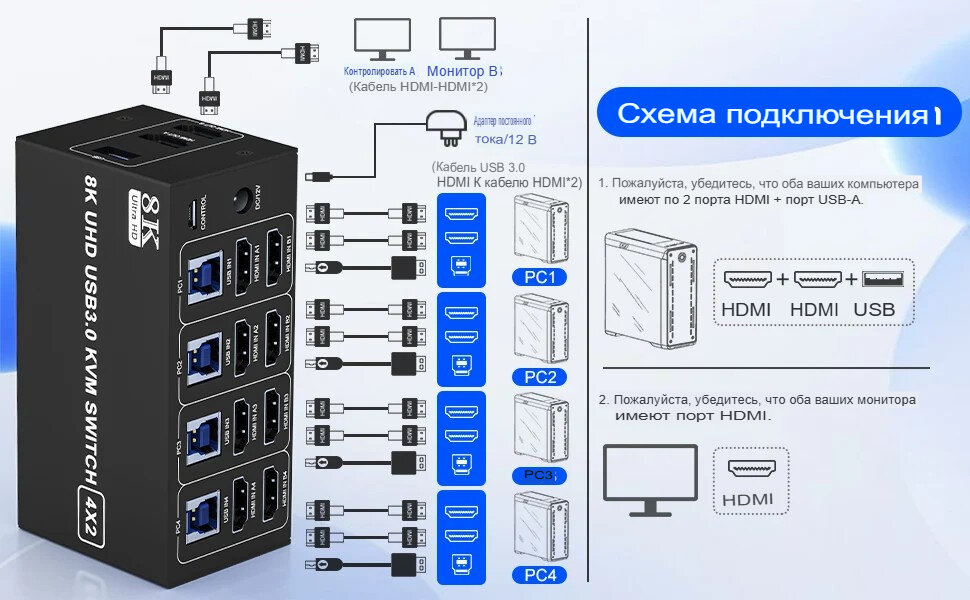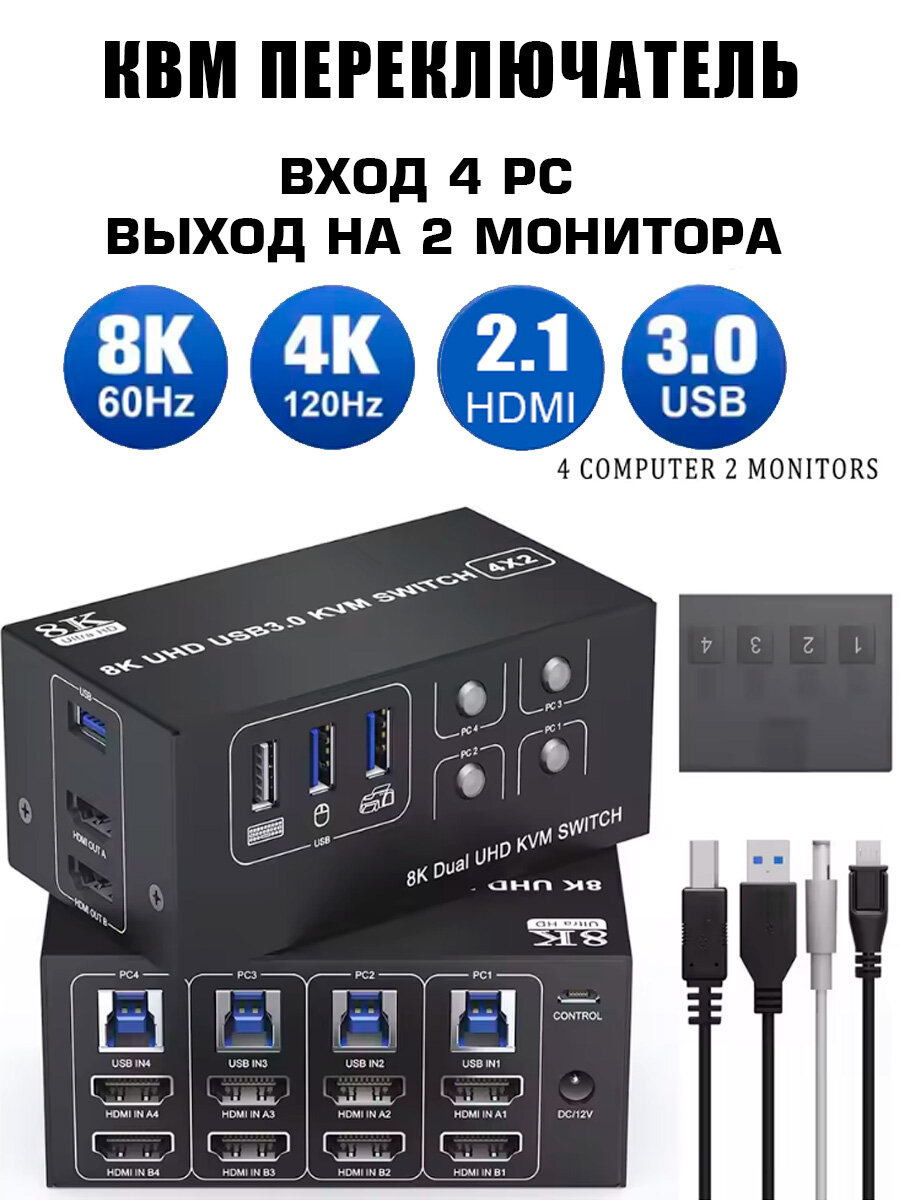 8K HDMI 2.1 HDMI KVM до 8K 60 Гц/4K 120 Гц, полностью совместим с обратным разрешением, таким как 4K при 60 Гц, 2K@120 Гц, 3D, 1080P и 720P. Примечание. Если вы хотите добиться 8K при 60 Гц, убедитесь, что источник сигнала, монитор и кабели поддерживают 8K.
