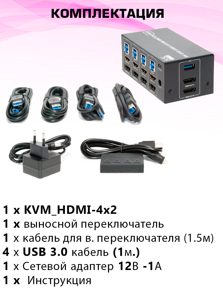 KVM-переключатель, выход на 2 монитора, вход на 4 компьютера.