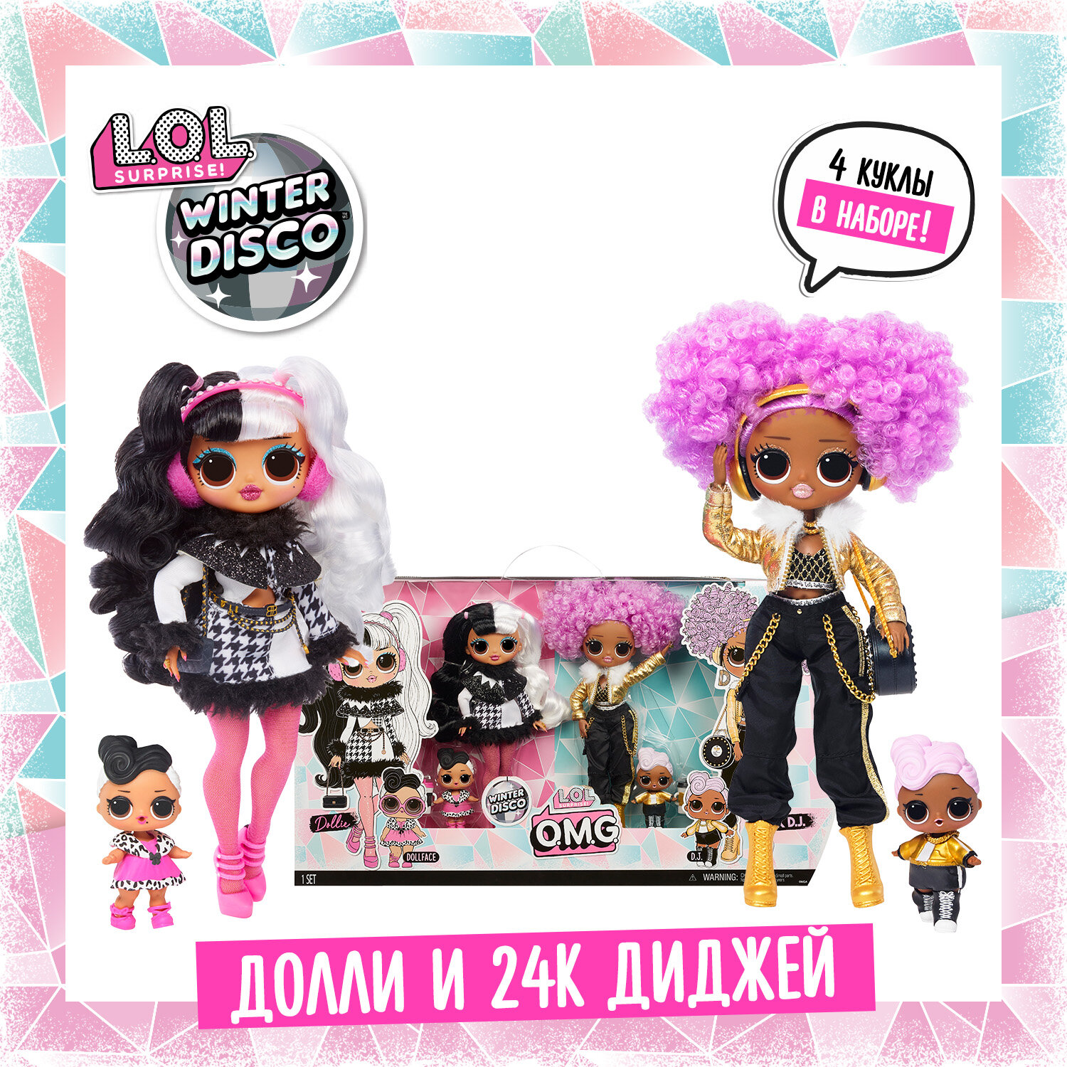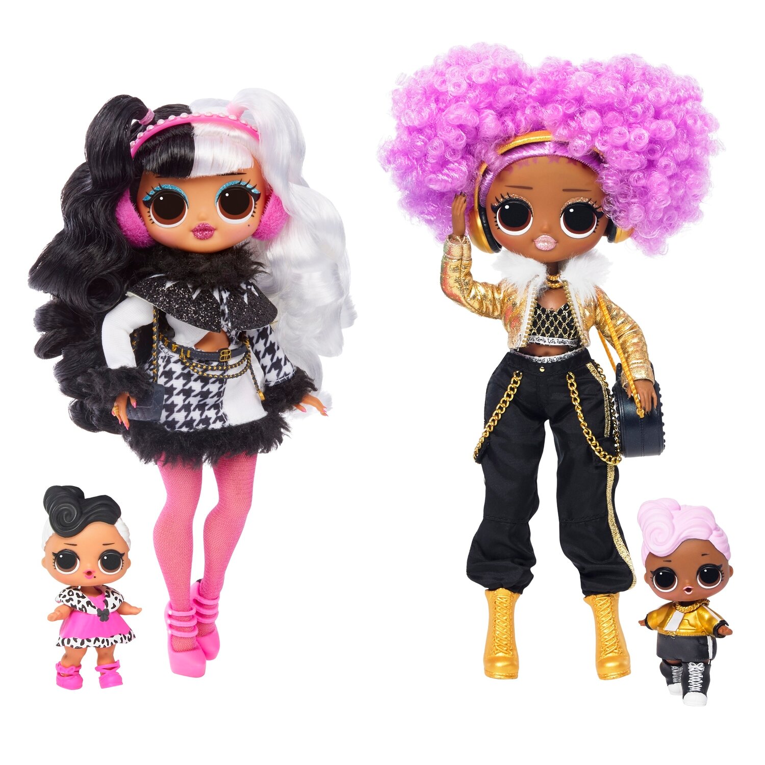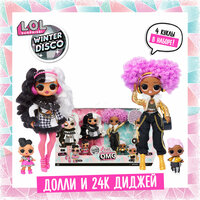 Кукла 24K D. J. с курчавыми ярко-сиреневыми волосами одета в коротки черно — золотистый топ с геометрическим орнаментом, черные брюки галифе с цепочками на карманах, золотую курточку с меховыми воротником и молнией, желтые высокие ботинки на шнуровке. Из аксессуаров есть наушники и модная сумочка. Маленькие куколки со светлыми молдированными волосами одеты в стиле старшей сестрички, а у пупса и питомца даже есть золотистые цепочки на шею. Аксессуары для большой куклы спрятаны с одной стороны чемодана, а маленькие куколки находятся в шарах ЛОЛ и в закрытых картонных отсеках другой части чемодана.