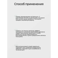 Перед применением хорошо встряхните флакон. Распылите желаемое кол-во на расстоянии 20 см от волос. В зависимости от желаемого эффекта равномерно распылите на сухие волосы. Подходит для фиксации прикорневого объема и начеса.