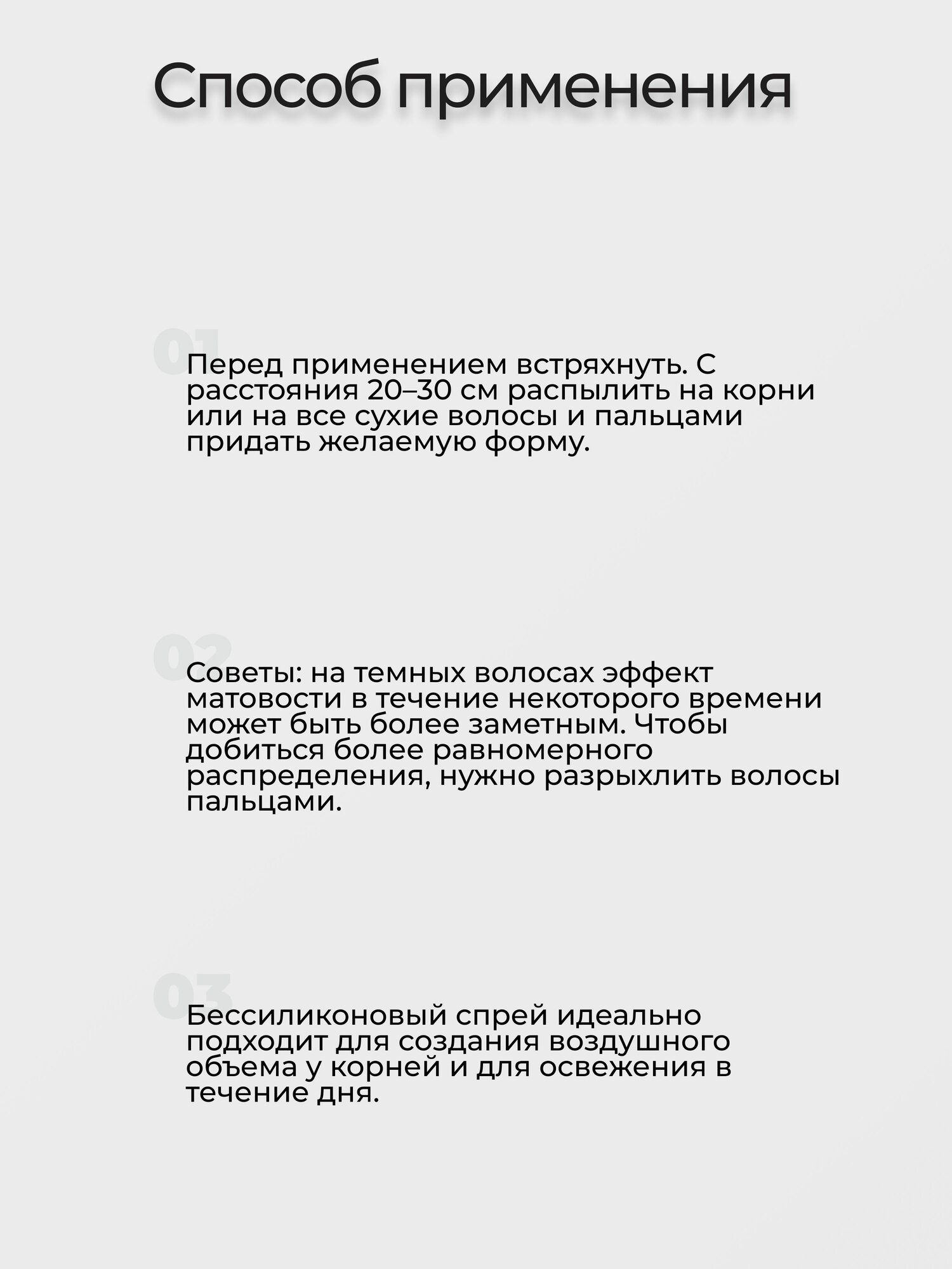 Преимущества: -Быстро и без следов абсорбирует излишки жира по всей длине волос. -Не утяжеляет, не склеивает волосы, не делает их «стеклянными». -Мгновенный модный стайлинг и рестайлинг прически. -Волосы приобретают естественный матовый блеск. -Придает волосам матовый финиш, а специальный крахмал устраняет нежелательный блеск. -Идеально для создания слегка небрежных образов. -Легко освежает прическу если нет времени помыть голову. -Подчеркивает текстуру и форму прически. -Изысканный стойкий аромат.