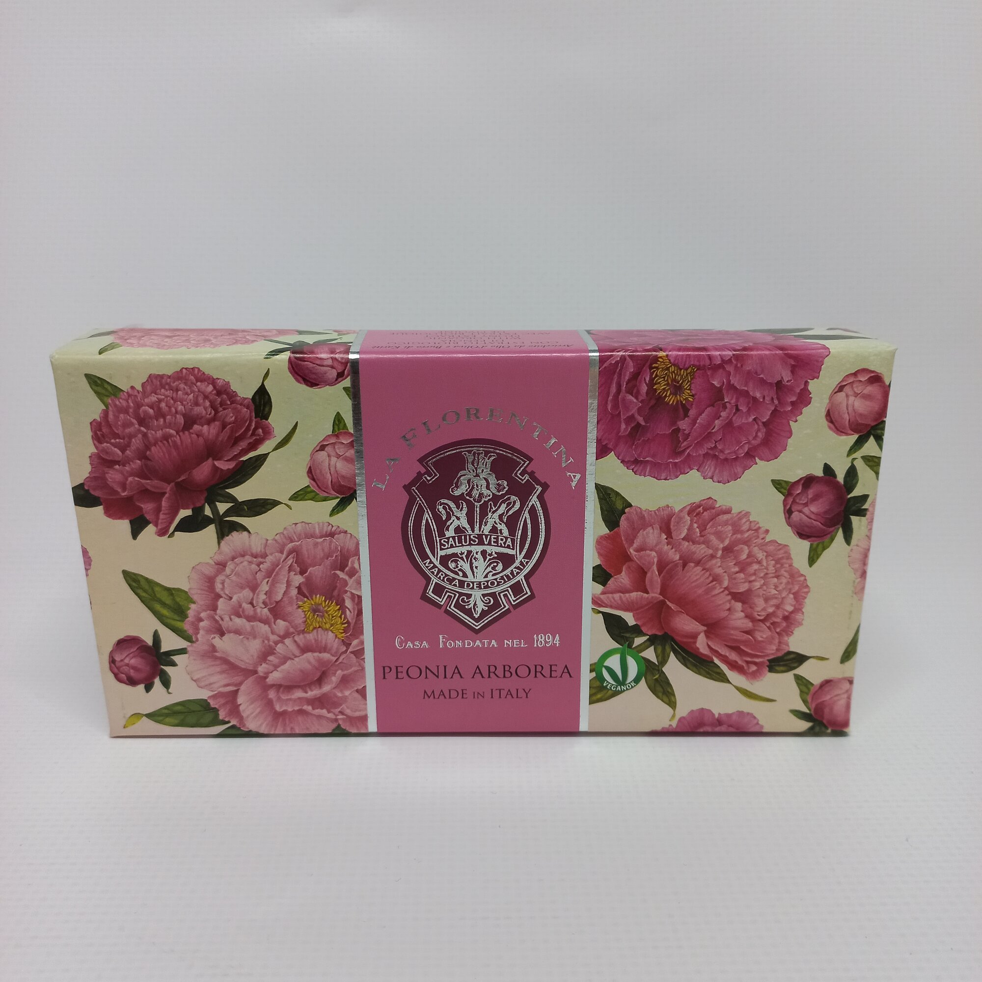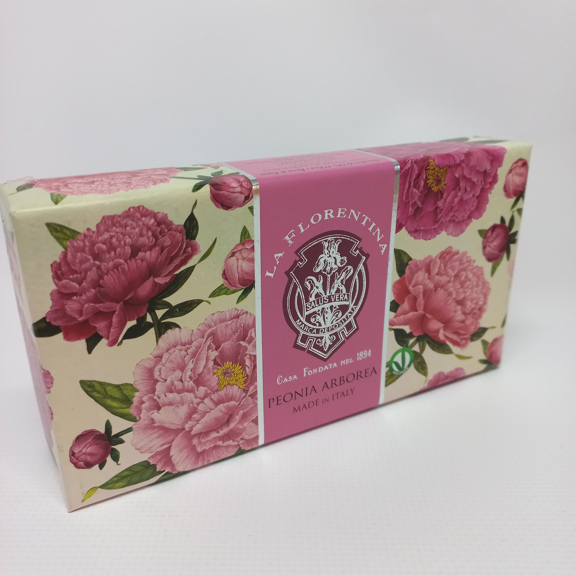 Набор туалетного твердого мыла La Florentina "Изысканный пион" представляет собой изысканный подарок для любителей утонченных ароматов. В комплект входят два бруска мыла, каждый из которых украшен гербовой печатью и упакован в роскошную красочную коробочку.